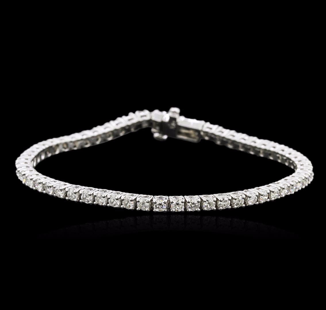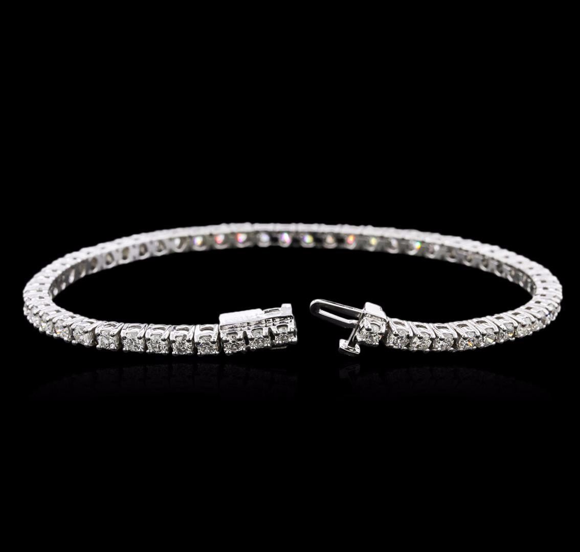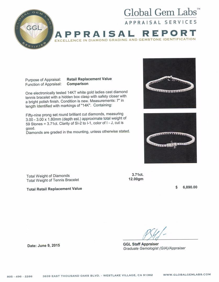 One electronically tested 14KT white gold ladies cast diamond tennis bracelet with a hidden box clasp with safety closer with a bright polish finish. Measurements: 7" in length Identified with markings of "14K". Condition is new. Containing: Fifty-Nine prong set round brilliant cut diamonds, measuring 3.00 - 3.00 x 1.80mm (depth est.) approximate total weight of 59 Stones = 3.71ct. Clarity: SI-2 to I-1. Color: I - J, Cut is Good. Diamonds are graded in the mounting, unless otherwise stated. Total Weight of Diamonds 3.71ct. Total Weight of Tennis Bracelet 12.00 grams. GGL Appraised at $6,890.00.