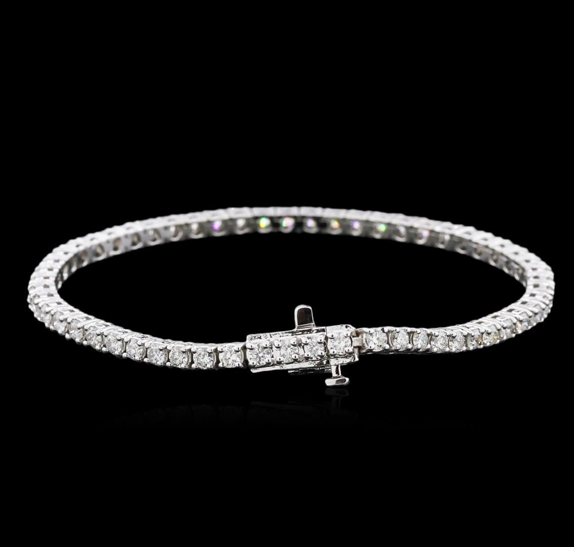 One electronically tested 14KT white gold ladies cast diamond tennis bracelet with a hidden box clasp with safety closer with a bright polish finish. Measurements: 7" in length Identified with markings of "14K". Condition is new. Containing: Fifty-Nine prong set round brilliant cut diamonds, measuring 3.00 - 3.00 x 1.80mm (depth est.) approximate total weight of 59 Stones = 3.71ct. Clarity: SI-2 to I-1. Color: I - J, Cut is Good. Diamonds are graded in the mounting, unless otherwise stated. Total Weight of Diamonds 3.71ct. Total Weight of Tennis Bracelet 12.00 grams. GGL Appraised at $6,890.00.