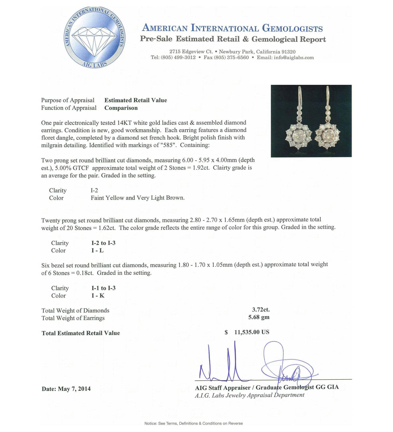 One pair electronically tested 14KT white gold ladies cast & assembled diamond earrings. Condition is new, good workmanship. Each earring features a diamond floret dangle, completed by a diamond set French hook. Bright polish finish with milgrain detailing. Identified with markings of "585". Containing: Two prong set round brilliant cut diamonds, measuring 6.00 - 5.95 x 4.00mm (depth est.), 5.00.%. GTCF approximate. Total Weight of 2 Stones = 1.92ct. Clarity grade is an average for the pair. Graded in the setting. Clarity I-2. Color: Faint Yellow and Very Light Brown. Twenty prong set round brilliant cut diamonds, measuring 2.80 - 2.70 x 1.65mm (depth est.) approximate. Total Weight of 20 Stones = 1.62ct. The color grade reflects the entire range of color for this group. Graded in the setting. Clarity: I-2 to I-3. Color: I - L Six bezel set round brilliant cut diamonds, measuring 1.80 - 1.70 x 1.05mm (depth est.) approximate. Total Weight of 6 Stones = 0.18ct. Graded in the setting. Clarity: I-1 to I-3. Color: I - K. Total Weight of Diamonds 3.72ct. Total Weight of Earrings 5.68 grams. AIG Appraised at $11,535.00.