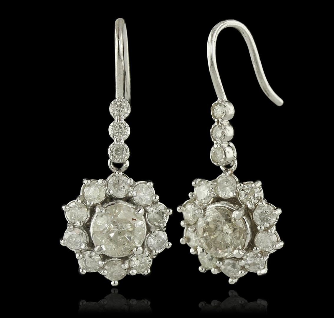 One pair electronically tested 14KT white gold ladies cast & assembled diamond earrings. Condition is new, good workmanship. Each earring features a diamond floret dangle, completed by a diamond set French hook. Bright polish finish with milgrain detailing. Identified with markings of "585". Containing: Two prong set round brilliant cut diamonds, measuring 6.00 - 5.95 x 4.00mm (depth est.), 5.00.%. GTCF approximate. Total Weight of 2 Stones = 1.92ct. Clarity grade is an average for the pair. Graded in the setting. Clarity I-2. Color: Faint Yellow and Very Light Brown. Twenty prong set round brilliant cut diamonds, measuring 2.80 - 2.70 x 1.65mm (depth est.) approximate. Total Weight of 20 Stones = 1.62ct. The color grade reflects the entire range of color for this group. Graded in the setting. Clarity: I-2 to I-3. Color: I - L Six bezel set round brilliant cut diamonds, measuring 1.80 - 1.70 x 1.05mm (depth est.) approximate. Total Weight of 6 Stones = 0.18ct. Graded in the setting. Clarity: I-1 to I-3. Color: I - K. Total Weight of Diamonds 3.72ct. Total Weight of Earrings 5.68 grams. AIG Appraised.