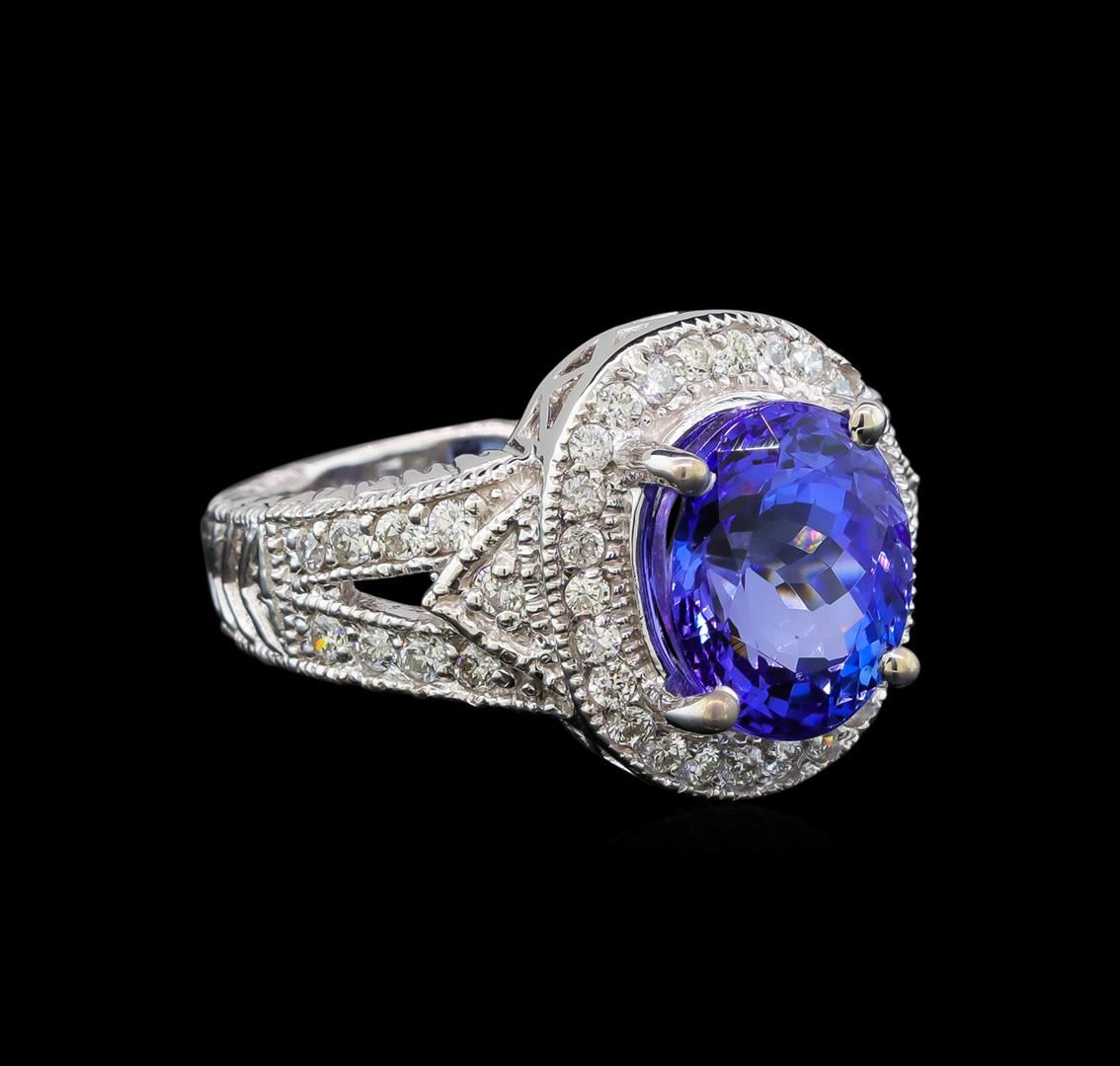 One electronically tested 14KT white gold ladies cast tanzanite and diamond ring with a bright polish finish. Condition is new. Containing: One prong set oval modified brilliant cut natural tanzanite, measuring 10.50 x 8.80 x 5.72mm, approximate weight of 3.72ct., clarity is eye clean, type I, medium light, very slightly grayish, violet color, (GIA V 4/3), cut is good. Forty-Two prong set round brilliant cut diamonds, measuring 1.50 - 1.50 x 0.90mm (depth est.) approximate total weight of 42 Stones = 0.52ct. Clarity: SI-1 to SI-2. Color: H - I, Cut is Good. Colored gemstones are presumed to have been subjected to commonly used enhancement processes. All diamonds and colored gemstones are graded in the mounting, unless otherwise stated. Total Weight of Colored Stones 3.72ct. Total Weight of Diamonds 0.52ct. Total Weight of Ring 8.30 grams. GGL Appraised at $5,820.00.