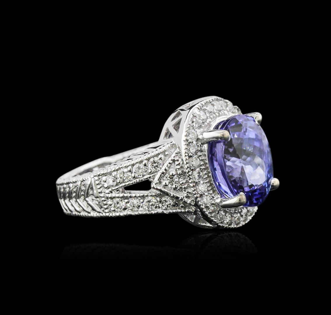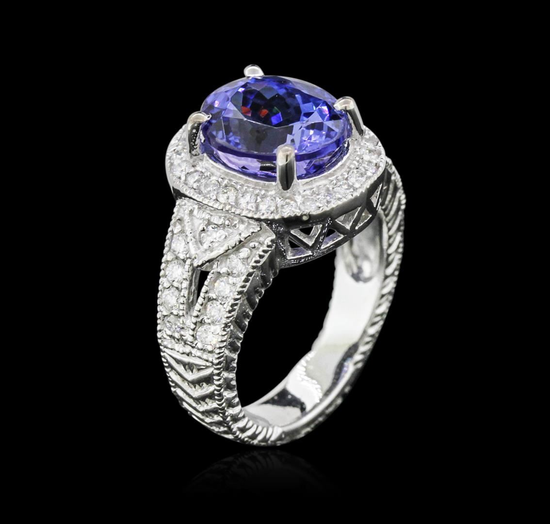 One electronically tested 14KT white gold ladies cast tanzanite and diamond ring with a bright polish finish. Condition is new. Containing: One prong set oval modified brilliant cut natural tanzanite, measuring 10.50 x 8.80 x 5.72mm, approximate weight of 3.72ct., clarity is eye clean, type I, medium light, very slightly grayish, violet color, (GIA V 4/3), cut is good. Forty-Two prong set round brilliant cut diamonds, measuring 1.50 - 1.50 x 0.90mm (depth est.) approximate total weight of 42 Stones = 0.52ct. Clarity: SI-1 to SI-2. Color: H - I, Cut is Good. Colored gemstones are presumed to have been subjected to commonly used enhancement processes. All diamonds and colored gemstones are graded in the mounting, unless otherwise stated. Total Weight of Colored Stones 3.72ct. Total Weight of Diamonds 0.52ct. Total Weight of Ring 8.30 grams. GGL Appraised at $5,820.00.