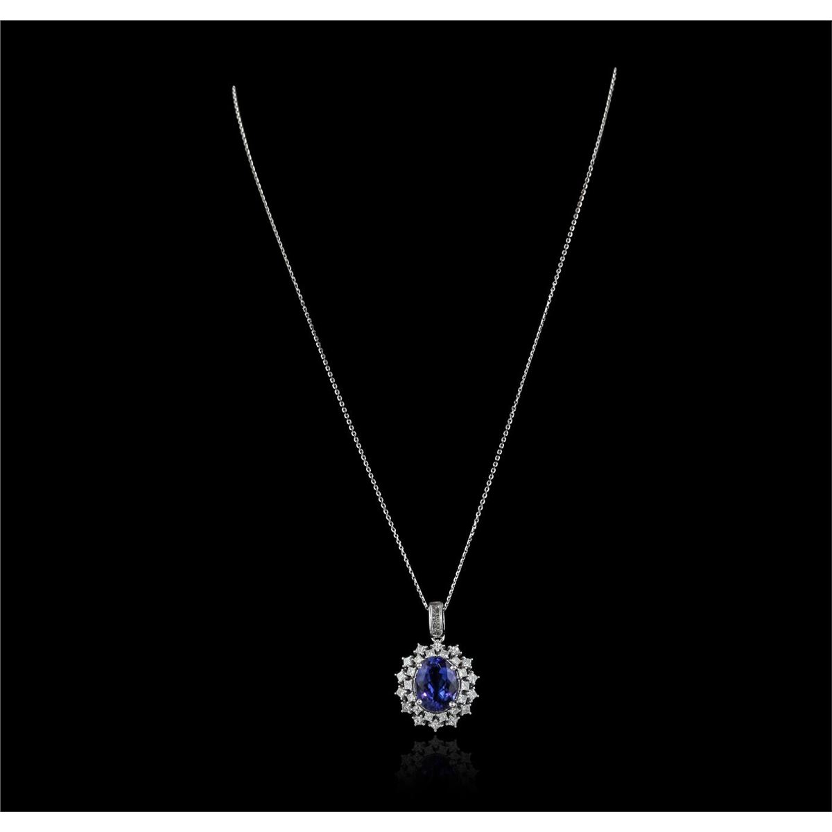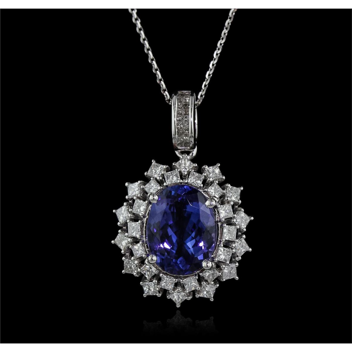 One electronically tested 14KT white gold ladies cast & assembled tanzanite and diamond pendant with chain. Condition is new, good workmanship. The pendant features a tanzanite set within a stylized diamond lattice gallery, completed by a diamond set white gold bail. The pendant is supported by an eighteen inch length 14KT white gold designer style chain, terminating in a spring ring clasp. Bright polish finish. Trademark is Orianne. Identified with markings of "14K". Containing: One prong set oval mixed cut natural tanzanite, measuring 11.70 x 9.00 x 4.90mm, 6%. bulge factor, approximate weight of 3.73ct., clarity is eye clean, type I, medium dark, very slightly grayish, bluish violet color, (GIA bV 6/3), cut is good. Transmitting light with no distortion, transparent. Graded in the setting. Tanzanite is a very rare gemstone that is only found in the country of Tanzania. Originally discovered in 1967. Tiffany & Company, named the stone Tanzanite. It is found in the Usumburu Mountains that border the Umba Valley of northern Tanzania. Tanzanite occurs in gray, brown, violet, blue, reddish-purple, & green. The gem is interesting because of its exceptional pleochroism. Rotated in different directions a tanzanite will exhibit multiple changes of color. Tanzanite has a low tolerance to ultrasonic cleaning, and should not be cleaned using this method. Twenty-Eight prong set princess cut diamonds, measuring 2.00 x 1.80 x 1.39mm (depth est.) approximate. Total Weight of 28 Stones = 1.15ct. Measurements are an average for the group. Graded in the setting. Clarity: SI-2 to I-2. Color: G - I Twenty invisible set square cut diamonds, measuring 0.90 x 0.90 x 0.56mm (depth est.) approximate. Total Weight of 20 Stones = 0.08ct. Measurements are an average for the group. Graded in the setting. Clarity: VS-1 to SI-1. Color: H - J. Total Weight of Colored Stones 3.73ct. Total Weight of Diamonds 1.23ct. Total Weight of Pendant With Chain 4.70 grams. AIG Appraised at $11,675.00.