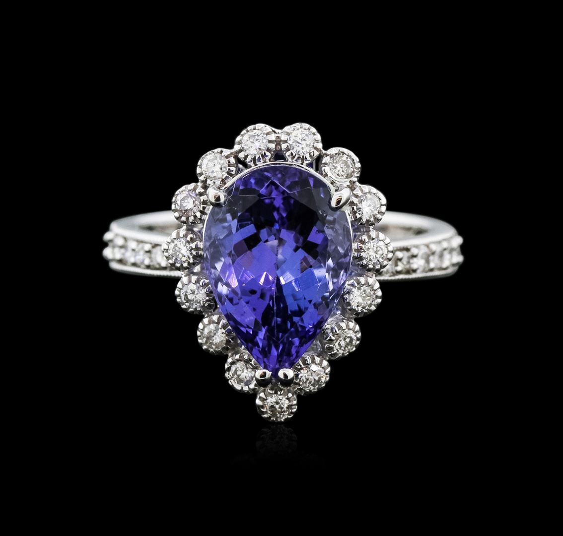 One electronically tested 14KT white gold ladies cast tanzanite and diamond ring with a flat shank with a bright polish finish. Trademark is Orianne. Identified with markings of "14K". Condition is new. Containing: One prong set pear modified brilliant cut natural tanzanite, measuring 12.80 x 8.00 x 5.44mm, approximate weight of 3.73ct., clarity is eye clean, type I, medium, moderately strong, violet color, (GIA V 5/4), cut is good. Twenty-Seven prong set round brilliant cut diamonds, measuring 1.50 - 1.30 x 0.84mm (depth est.) approximate total weight of 27 Stones = 0.27ct. Clarity: SI-2 to I-2. Color: I - J, Cut is Good. All diamonds and colored gemstones are graded in the mounting, unless otherwise stated. Colored gemstones are presumed to have been subjected to commonly used enhancement processes. Total Weight of Colored Stones 3.73ct. Total Weight of Diamonds 0.27ct. Total Weight of Ring 4.80 grams. GGL Appraised at $4,090.00.
