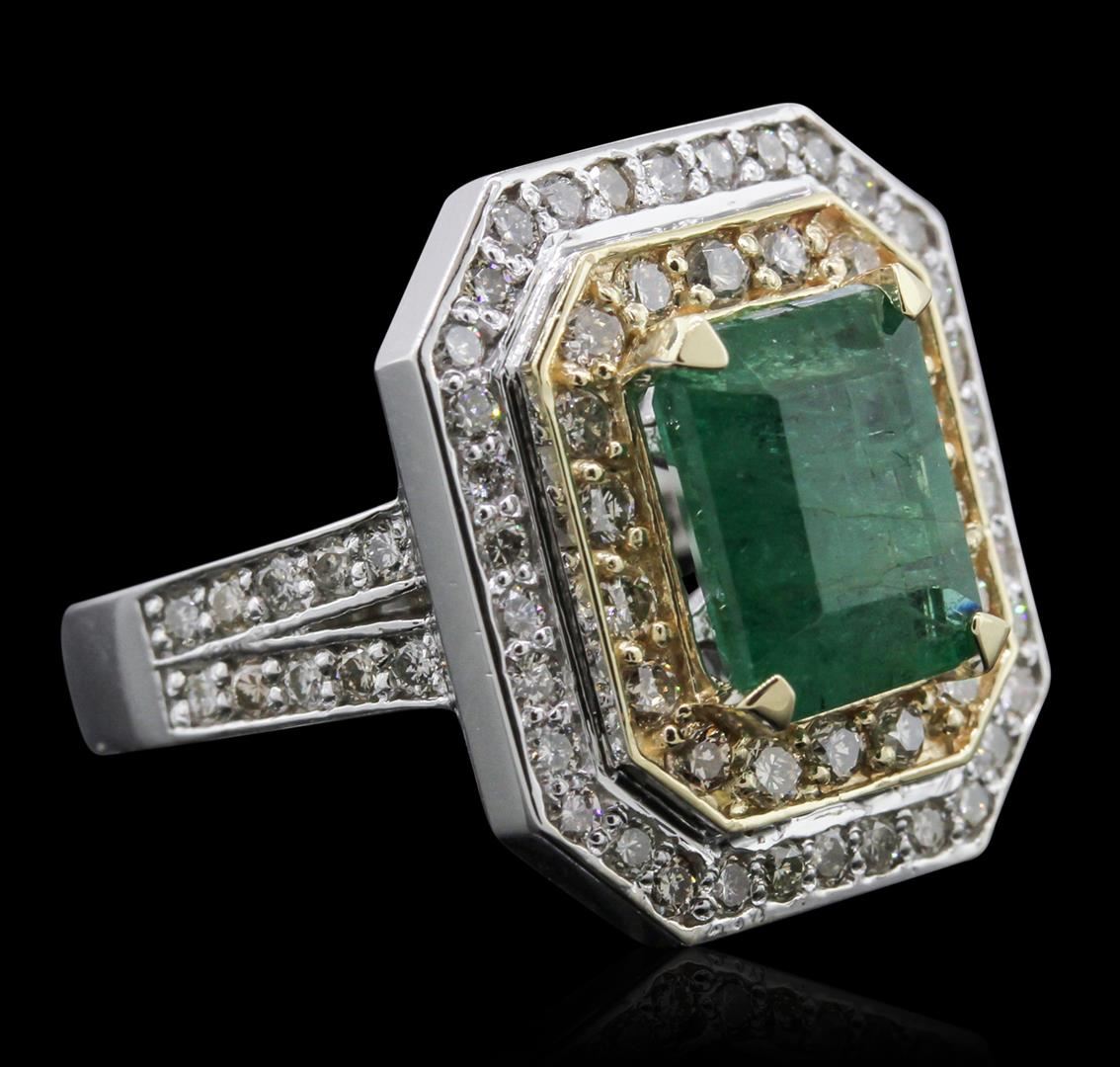One electronically tested 14KT white gold ladies cast emerald and diamond ring. Condition is new, good workmanship. The featured emerald is set within a two tiered diamond bezel, supported by diamond set split shoulders and completed by a three millimeter wide band. Bright polish finish with yellow gold accents. Identified with markings of "14K". Containing: One prong set rectangular step cut natural emerald, measuring 9.80 x 7.90 x 5.60mm, 6%. bulge factor, approximate weight of 3.75ct., clarity is heavily included, type III, medium dark, moderately strong, very slightly bluish green color, (GIA vslbG 6/4), cut is good. Transmitting light with a minimum of distortion, transparent to translucent. Naturally occurring internal & external characteristics are present. Indications of oil residue. Graded in the setting. Seventy-Three bead set round brilliant cut diamonds, measuring 1.90 - 1.60 x 1.05mm (depth est.) approximate. Total Weight of 73 Stones = 1.53ct. The color grade ranges from faint to very light brown in color for this group. Graded in the setting. Clarity: SI-1 to I-1. Total Weight of Colored Stones 3.75ct. Total Weight of Diamonds 1.53ct. Total Weight of Ring 11.30 grams. AIG Appraised at $12,320.00.