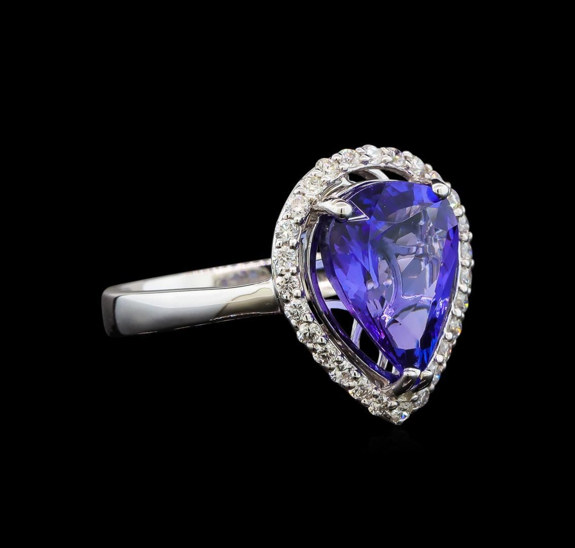 One electronically tested 14KT white gold ladies cast tanzanite and diamond ring with a half round shank with a bright polish finish. Trademark is Orianne. Identified with markings of "14K". Condition is new. Containing: One prong set pear modified brilliant cut natural tanzanite, measuring 10.99 x 9.12 x 5.60mm, approximate weight of 3.76ct., clarity is eye clean, type I, medium light, very slightly grayish, violet color, (GIA V 4/3), cut is good. Twelve prong set round brilliant cut diamonds, measuring 1.30 - 1.30 x 0.78mm (depth est.) approximate total weight of 12 Stones = 0.10 ct. Clarity: SI-1 to SI-2. Color: I - J. All diamonds and colored gemstones are graded in the mounting, unless otherwise stated. Colored gemstones are presumed to have been subjected to commonly used enhancement processes. Total Weight of Colored Stones 3.76ct. Total Weight of Diamonds 0.10 ct. Total Weight of Ring 3.70 grams. GGL Appraised.