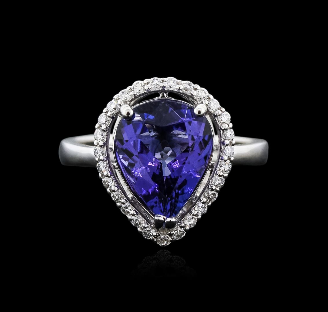 One electronically tested 14KT white gold ladies cast tanzanite and diamond ring with a half round shank with a bright polish finish. Trademark is Orianne. Identified with markings of "14K". Condition is new. Containing: One prong set pear modified brilliant cut natural tanzanite, measuring 10.99 x 9.12 x 5.60mm, approximate weight of 3.76ct., clarity is eye clean, type I, medium light, very slightly grayish, violet color, (GIA V 4/3), cut is good. Twelve prong set round brilliant cut diamonds, measuring 1.30 - 1.30 x 0.78mm (depth est.) approximate total weight of 12 Stones = 0.10ct. Clarity: SI-1 to SI-2. Color: I - J. All diamonds and colored gemstones are graded in the mounting, unless otherwise stated. Colored gemstones are presumed to have been subjected to commonly used enhancement processes. Total Weight of Colored Stones 3.76ct. Total Weight of Diamonds 0.10ct. Total Weight of Ring 3.70 grams. GGL Appraised at $3,490.00.