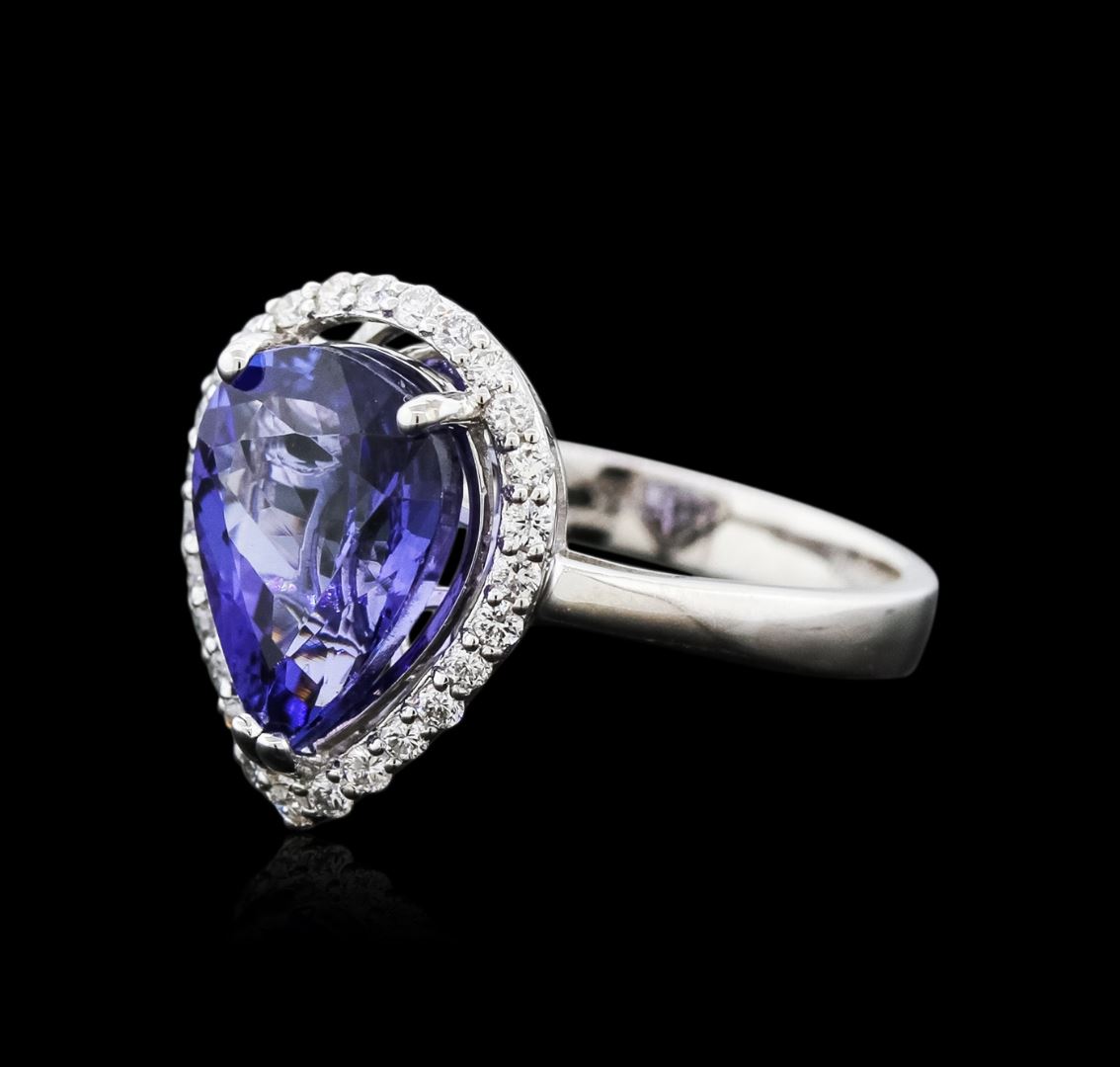 One electronically tested 14KT white gold ladies cast tanzanite and diamond ring with a half round shank with a bright polish finish. Trademark is Orianne. Identified with markings of "14K". Condition is new. Containing: One prong set pear modified brilliant cut natural tanzanite, measuring 10.99 x 9.12 x 5.60mm, approximate weight of 3.76ct., clarity is eye clean, type I, medium light, very slightly grayish, violet color, (GIA V 4/3), cut is good. Twelve prong set round brilliant cut diamonds, measuring 1.30 - 1.30 x 0.78mm (depth est.) approximate total weight of 12 Stones = 0.10ct. Clarity: SI-1 to SI-2. Color: I - J. All diamonds and colored gemstones are graded in the mounting, unless otherwise stated. Colored gemstones are presumed to have been subjected to commonly used enhancement processes. Total Weight of Colored Stones 3.76ct. Total Weight of Diamonds 0.10ct. Total Weight of Ring 3.70 grams. GGL Appraised at $3,490.00.