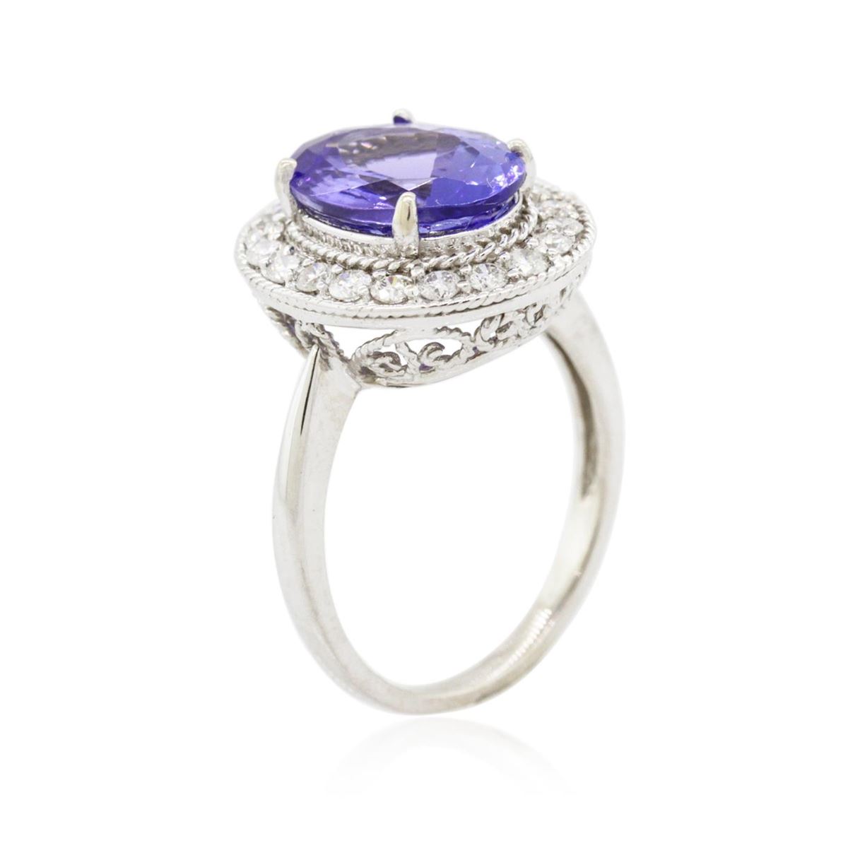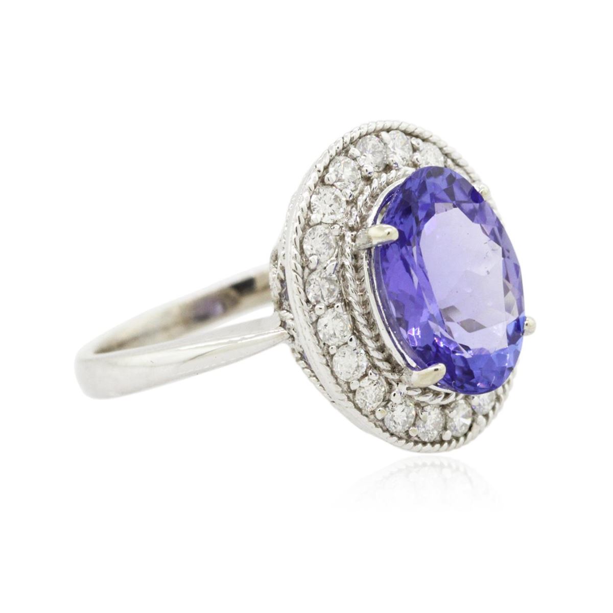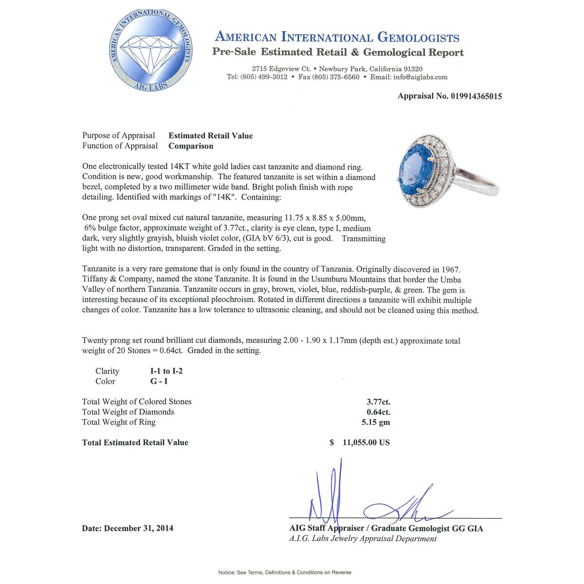One electronically tested 14KT white gold ladies cast tanzanite and diamond ring. The featured tanzanite is set within a diamond bezel, completed by a two millimeter wide band. Bright polish finish with rope detailing. Identified with markings of "14K". Condition is new, good workmanship. Containing: One prong set oval mixed cut natural tanzanite, measuring 11.75 x 8.85 x 5.00mm, 6% bulge factor, approximate weight of 3.77ct., clarity is eye clean, type I, medium dark, very slightly grayish, bluish violet color, (GIA bV 6/3), cut is good. Transmitting light with no distortion, transparent. Graded in the setting. Tanzanite is a very rare gemstone that is only found in the country of Tanzania. Originally discovered in 1967. Tiffany & Company, named the stone Tanzanite. It is found in the Usumburu Mountains that border the Umba Valley of northern Tanzania. Tanzanite occurs in gray, brown, violet, blue, reddish-purple, & green. The gem is interesting because of its exceptional pleochroism. Rotated in different directions a tanzanite will exhibit multiple changes of color. Tanzanite has a low tolerance to ultrasonic cleaning, and should not be cleaned using this method. Twenty prong set round brilliant cut diamonds, measuring 2.00 - 1.90 x 1.17mm (depth est.) approximate total weight of 20 Stones = 0.64ct. Graded in the setting. Clarity: I-1 to I-2. Color: G - I. Total Weight of Colored Stones 3.77ct. Total Weight of Diamonds 0.64ct. Total Weight of Ring 5.15 grams. AIG Appraised at $11,055.00.