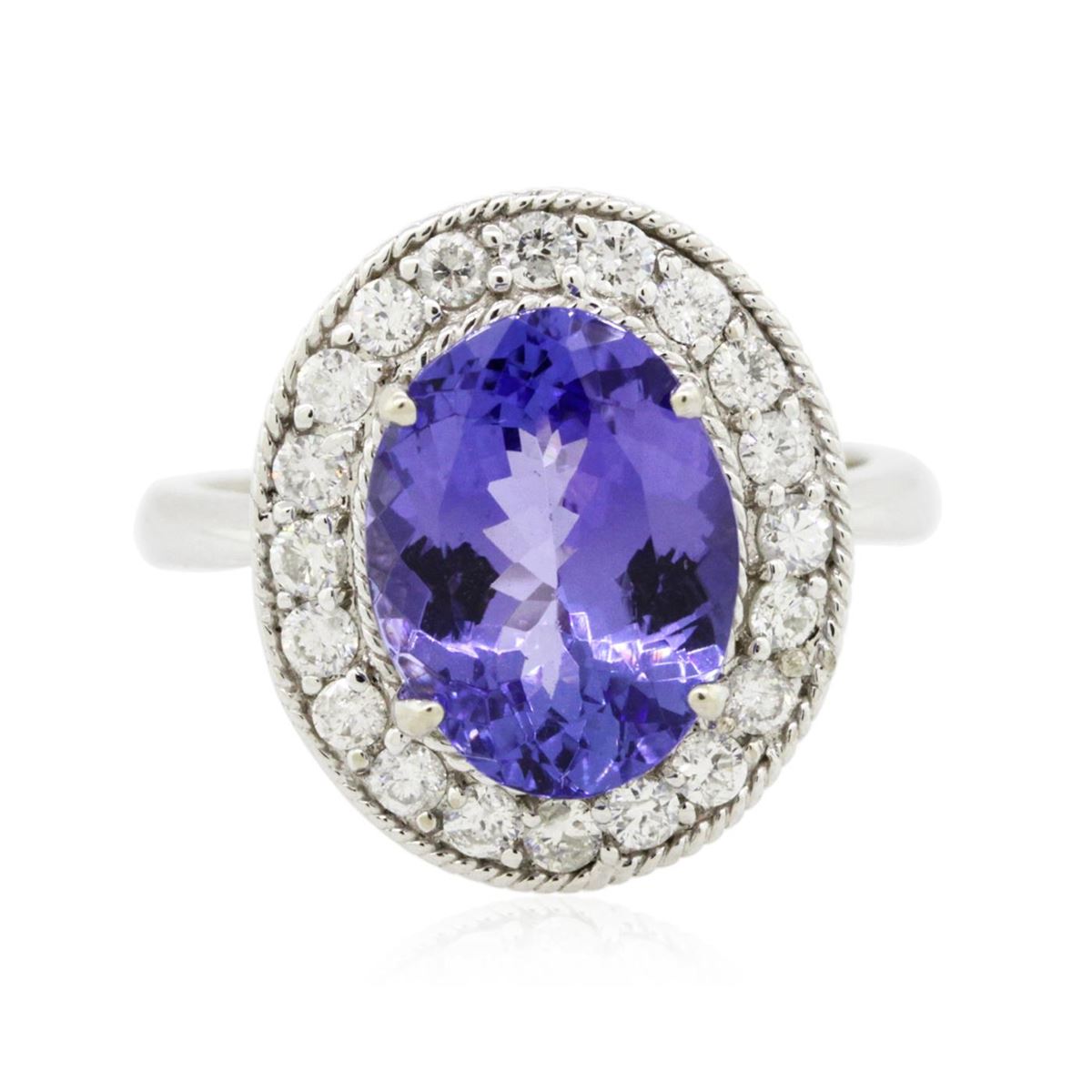 One electronically tested 14KT white gold ladies cast tanzanite and diamond ring. The featured tanzanite is set within a diamond bezel, completed by a two millimeter wide band. Bright polish finish with rope detailing. Identified with markings of "14K". Condition is new, good workmanship. Containing: One prong set oval mixed cut natural tanzanite, measuring 11.75 x 8.85 x 5.00mm, 6% bulge factor, approximate weight of 3.77ct., clarity is eye clean, type I, medium dark, very slightly grayish, bluish violet color, (GIA bV 6/3), cut is good. Transmitting light with no distortion, transparent. Graded in the setting. Tanzanite is a very rare gemstone that is only found in the country of Tanzania. Originally discovered in 1967. Tiffany & Company, named the stone Tanzanite. It is found in the Usumburu Mountains that border the Umba Valley of northern Tanzania. Tanzanite occurs in gray, brown, violet, blue, reddish-purple, & green. The gem is interesting because of its exceptional pleochroism. Rotated in different directions a tanzanite will exhibit multiple changes of color. Tanzanite has a low tolerance to ultrasonic cleaning, and should not be cleaned using this method. Twenty prong set round brilliant cut diamonds, measuring 2.00 - 1.90 x 1.17mm (depth est.) approximate total weight of 20 Stones = 0.64ct. Graded in the setting. Clarity: I-1 to I-2. Color: G - I. Total Weight of Colored Stones 3.77ct. Total Weight of Diamonds 0.64ct. Total Weight of Ring 5.15 grams. AIG Appraised at $11,055.00.