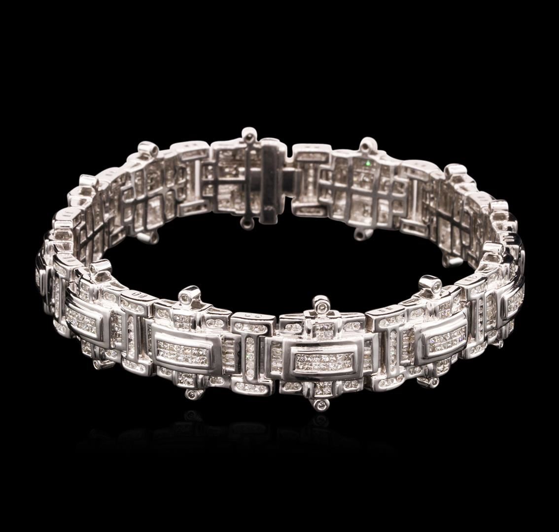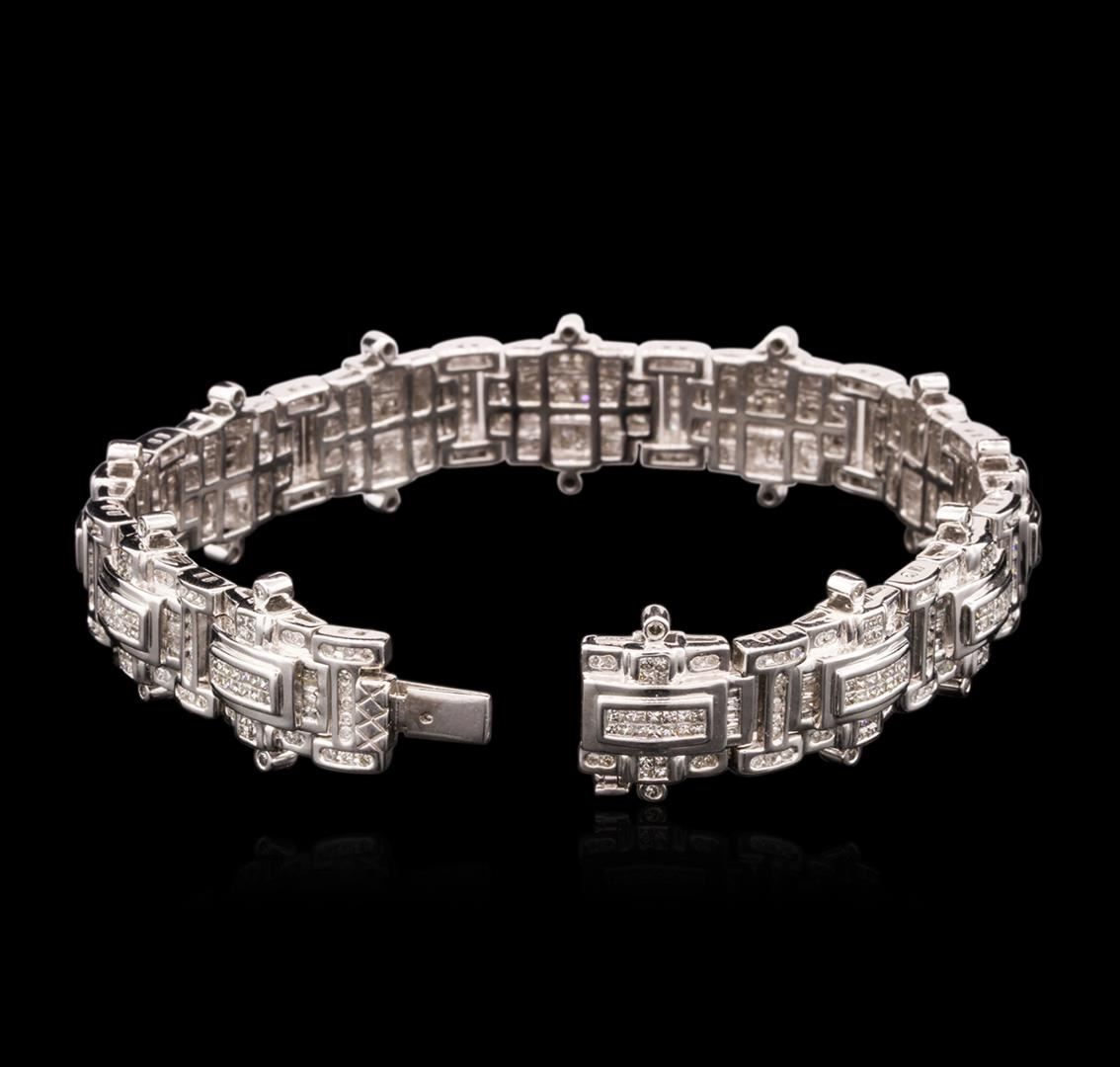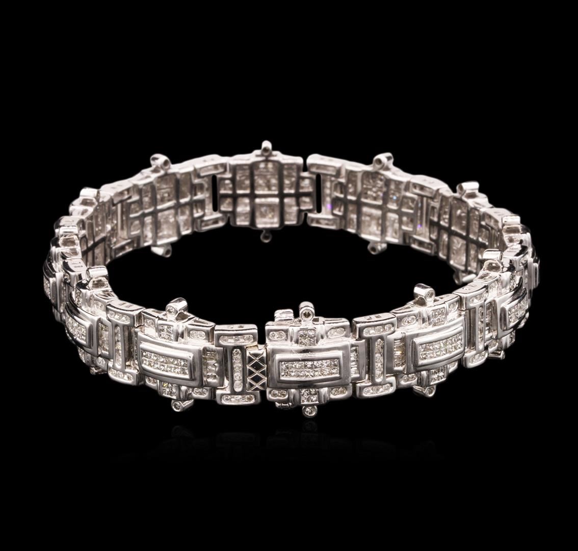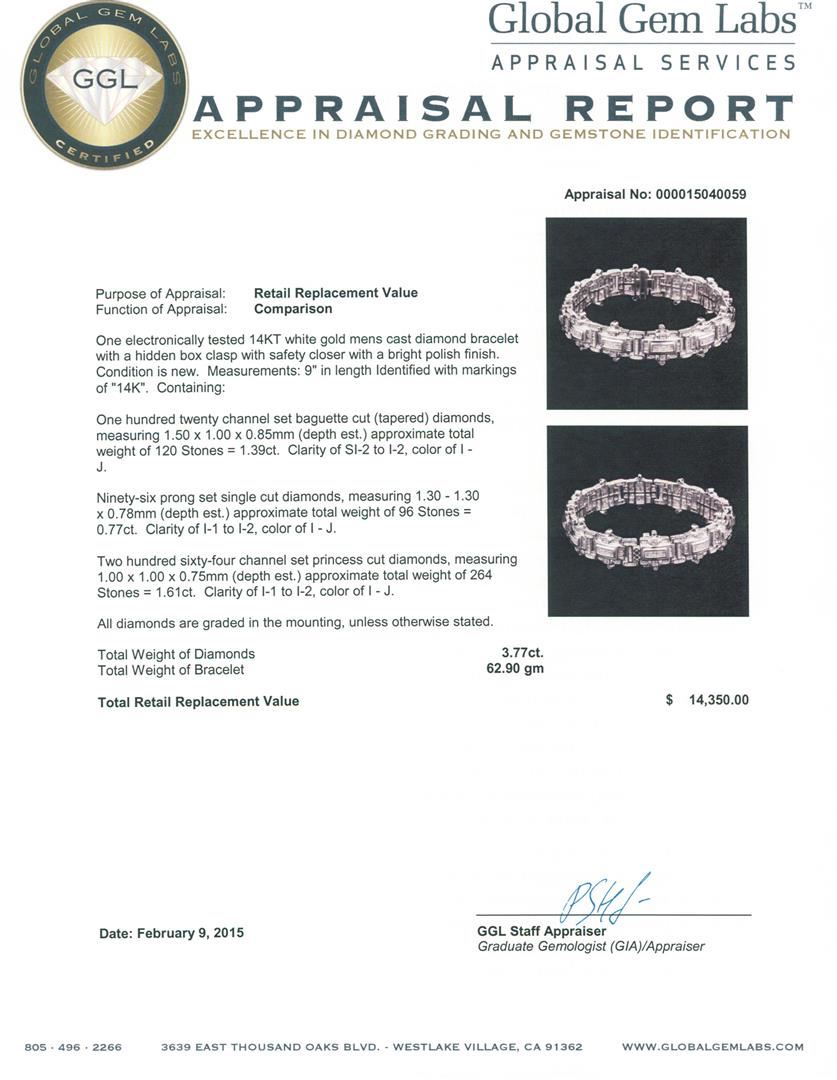 One electronically tested 14KT white gold mens cast diamond bracelet with a hidden box clasp with safety closer with a bright polish finish. Measurements: 9" in length Identified with markings of "14K". Condition is new. Containing: One Hundred Twenty channel set baguette cut (tapered) diamonds, measuring 1.50 x 1.00 x 0.85mm (depth est.) approximate total weight of 120 Stones = 1.39ct. Clarity: SI-2 to I-2. Color: I - J. Ninety-Six prong set single cut diamonds, measuring 1.30 - 1.30 x 0.78mm (depth est.) approximate total weight of 96 Stones = 0.77ct. Clarity: I-1 to I-2. Color: I - J. Two Hundred Sixty-Four channel set princess cut diamonds, measuring 1.00 x 1.00 x 0.75mm (depth est.) approximate total weight of 264 Stones = 1.61ct. Clarity: I-1 to I-2. Color: I - J. All diamonds are graded in the mounting, unless otherwise stated. Total Weight of Diamonds 3.77ct. Total Weight of Bracelet 62.90 grams. GGL Appraised at $14,350.00.