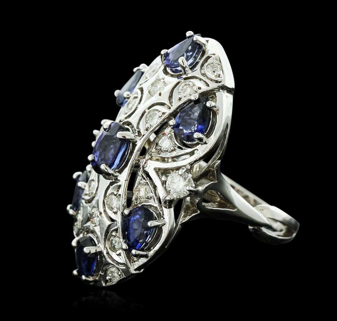 One electronically tested 14KT white gold ladies cast sapphire and diamond ring with a bright polish finish. Identified with markings of "K14". Condition is new. Containing: One prong set oval modified brilliant cut natural blue sapphire, measuring 7.00. x 5.00. x 3.25mm, approximate weight of 0.96ct., clarity is eye clean, type II, medium, moderately strong, blue color, (GIA B 5/4), cut is good. Six prong set pear modified brilliant cut natural blue sapphires, measuring 5.70 x 4.00. x 2.60mm, approximate total weight of 2.82ct., clarity is eye clean, type II, medium, moderately strong, blue color, (GIA B 5/4), cut is good. Twenty prong set round brilliant cut diamonds, measuring 3.00. - 1.80 x 1.44mm (depth est.) approximate total weight of 20 Stones = 1.01ct. Clarity: SI-2 to I-2. Color: H - I, Cut is Good. Colored gemstones are presumed to have been subjected to commonly used enhancement processes. All diamonds and colored gemstones are graded in the mounting, unless otherwise stated. Total Weight of Colored Stones 3.78ct. Total Weight of Diamonds 1.01ct. Total Weight of Ring 12.30 grams. GGL Appraised at $4,575.00.