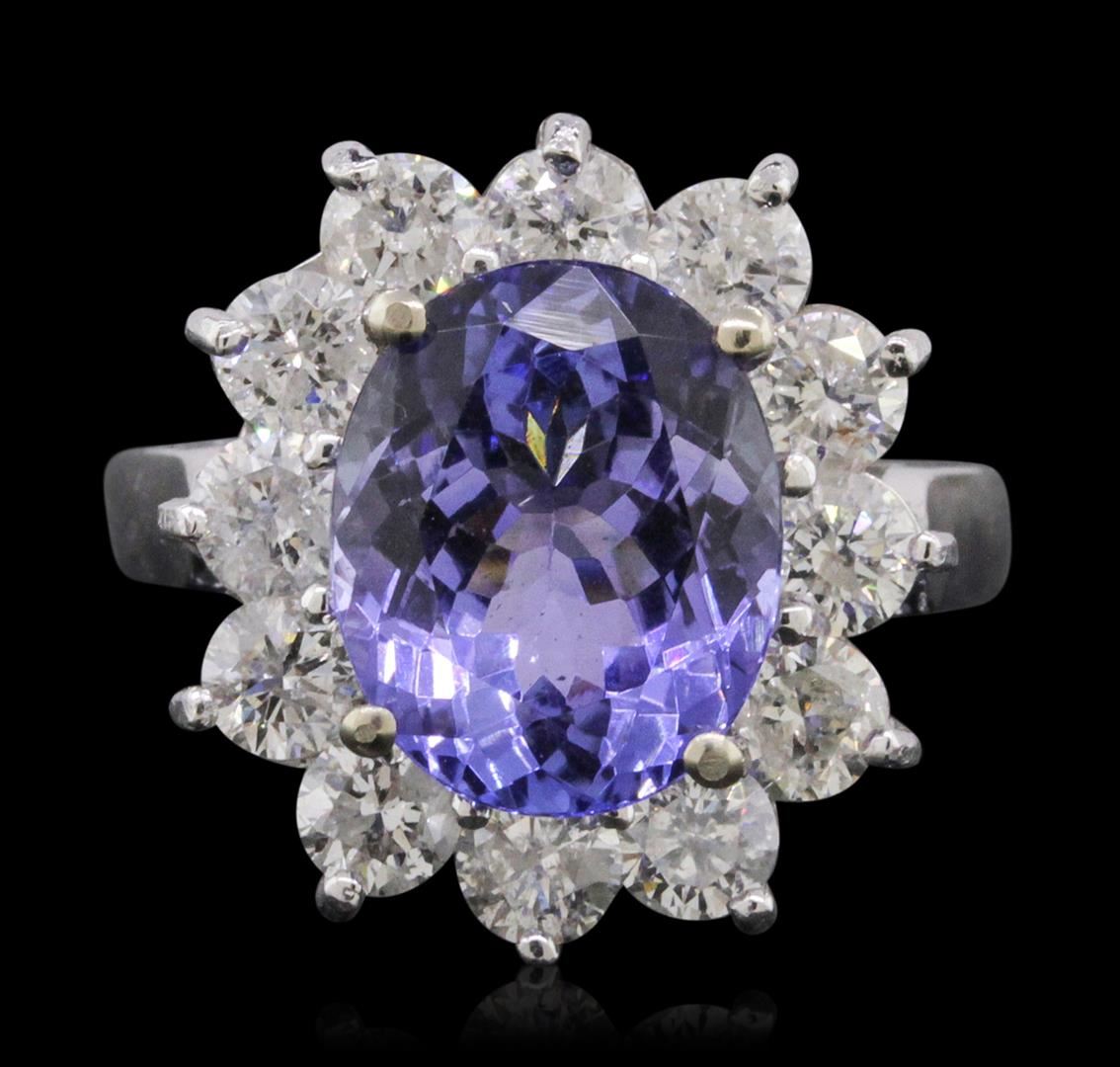 One electronically tested 14KT white gold ladies combination cast & assembled tanzanite and diamond ring with a flat shank with a bright polish finish. Identified with markings of "14K". Condition is new. Containing: One prong set oval modified brilliant cut natural tanzanite, measuring 11.08 x 9.01 x 5.62mm, approximate weight of 3.80ct., clarity is eye clean, type I, medium, moderately strong, violet color, (GIA V 5/4), cut is good. Twelve prong set round brilliant cut diamonds, measuring 3.20 - 3.20 x 1.92mm (depth est.) approximate total weight of 12 Stones = 1.44ct. Clarity: SI-2 to I-1. Color: I - J, Cut is Good. Colored gemstones are presumed to have been subjected to commonly used enhancement processes. All diamonds and colored gemstones are graded in the mounting, unless otherwise stated. Total Weight of Colored Stones 3.80ct. Total Weight of Diamonds 1.44ct. Total Weight of Ring 5.70 grams. GGL Appraised at $10,365.00.