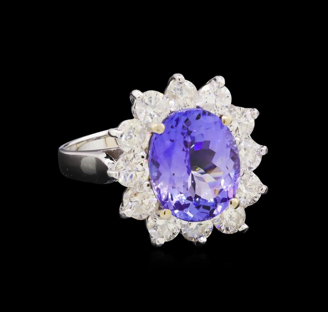 One electronically tested 14KT white gold ladies combination cast & assembled tanzanite and diamond ring with a flat shank with a bright polish finish. Identified with markings of "14K". Condition is new. Containing: One prong set oval modified brilliant cut natural tanzanite, measuring 11.08 x 9.01 x 5.62mm, approximate weight of 3.80 ct., clarity is eye clean, type I, medium, moderately strong, violet color, (GIA V 5/4), cut is good. Twelve prong set round brilliant cut diamonds, measuring 3.20 - 3.20 x 1.92mm (depth est.) approximate total weight of 12 Stones = 1.44ct. Clarity: SI-2 to I-1. Color: I - J, Cut is Good. Colored gemstones are presumed to have been subjected to commonly used enhancement processes. All diamonds and colored gemstones are graded in the mounting, unless otherwise stated. Total Weight of Colored Stones 3.80 ct. Total Weight of Diamonds 1.44ct. Total Weight of Ring 5.70 grams. GGL Appraised.