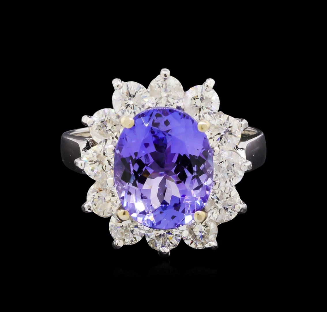 One electronically tested 14KT white gold ladies combination cast & assembled tanzanite and diamond ring with a flat shank with a bright polish finish. Identified with markings of "14K". Condition is new. Containing: One prong set oval modified brilliant cut natural tanzanite, measuring 11.08 x 9.01 x 5.62mm, approximate weight of 3.80 ct., clarity is eye clean, type I, medium, moderately strong, violet color, (GIA V 5/4), cut is good. Twelve prong set round brilliant cut diamonds, measuring 3.20 - 3.20 x 1.92mm (depth est.) approximate total weight of 12 Stones = 1.44ct. Clarity: SI-2 to I-1. Color: I - J, Cut is Good. Colored gemstones are presumed to have been subjected to commonly used enhancement processes. All diamonds and colored gemstones are graded in the mounting, unless otherwise stated. Total Weight of Colored Stones 3.80 ct. Total Weight of Diamonds 1.44ct. Total Weight of Ring 5.70 grams. GGL Appraised.