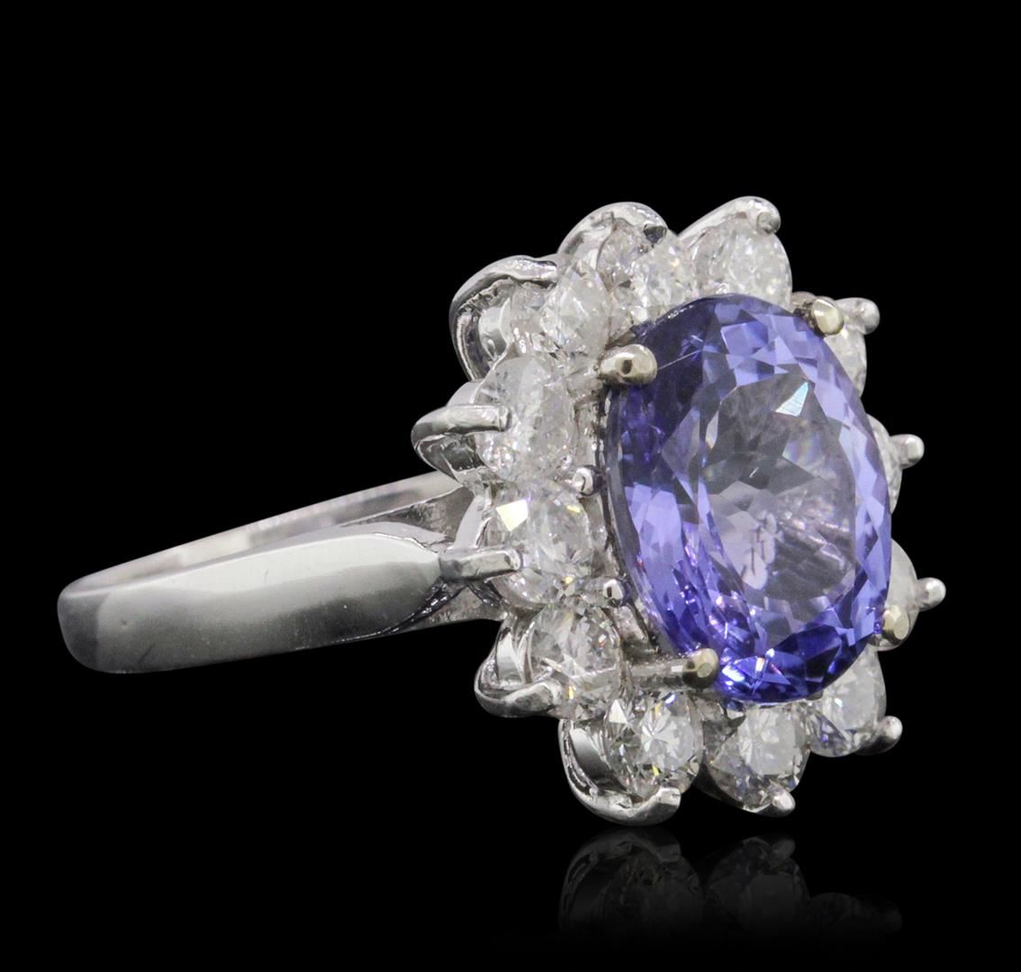 One electronically tested 14KT white gold ladies combination cast & assembled tanzanite and diamond ring with a flat shank with a bright polish finish. Identified with markings of "14K". Condition is new. Containing: One prong set oval modified brilliant cut natural tanzanite, measuring 11.08 x 9.01 x 5.62mm, approximate weight of 3.80ct., clarity is eye clean, type I, medium, moderately strong, violet color, (GIA V 5/4), cut is good. Twelve prong set round brilliant cut diamonds, measuring 3.20 - 3.20 x 1.92mm (depth est.) approximate total weight of 12 Stones = 1.44ct. Clarity: SI-2 to I-1. Color: I - J, Cut is Good. Colored gemstones are presumed to have been subjected to commonly used enhancement processes. All diamonds and colored gemstones are graded in the mounting, unless otherwise stated. Total Weight of Colored Stones 3.80ct. Total Weight of Diamonds 1.44ct. Total Weight of Ring 5.70 grams. GGL Appraised at $10,365.00.
