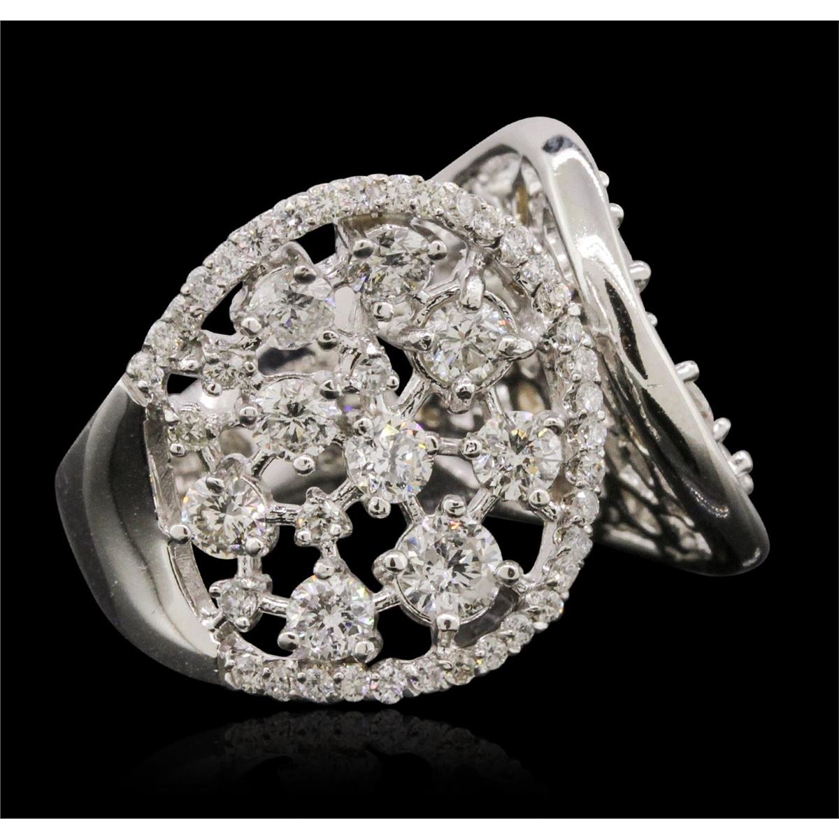 One electronically tested 14KT white gold ladies cast diamond ring with a bright polish finish. Condition is good. The ring features a stylized diamond set by-pass design, completed by a five millimeter wide band. Identified with markings of "14K". Containing: Five prong set round brilliant cut diamonds, measuring 4.10 - 4.00 x 2.43mm (depth est.) approximate. Total Weight of 5 Stones = 1.31ct. Graded in the setting. Clarity: SI-2 to I-1. Color: G - H Fifteen prong set round brilliant cut diamonds, measuring 3.30 - 3.00 x 1.89mm (depth est.) approximate. Total Weight of 15 Stones = 1.81ct. Graded in the setting. Clarity: SI-1 to I-1. Color: G - H Forty-Four prong set round brilliant cut diamonds, measuring 1.60 - 1.50 x 0.93mm (depth est.) approximate. Total Weight of 44 Stones = 0.69ct. Graded in the setting. Clarity: SI-1 to I-1. Color: G - H. Total Weight of Diamonds 3.81ct. Total Weight of Ring 10.28gm. AIG Appraised at $14,930.00.