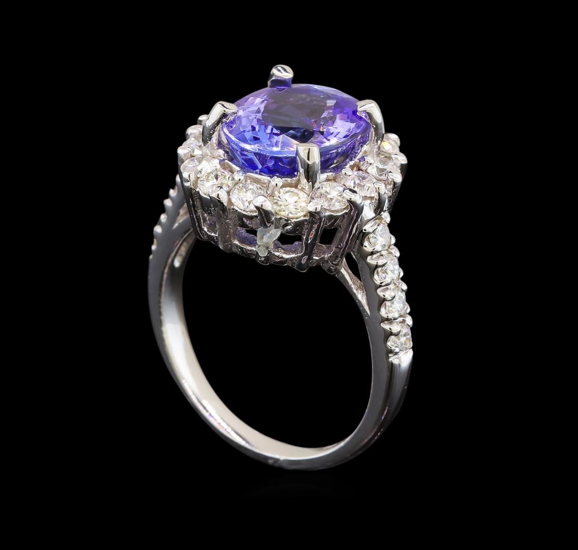 One electronically tested 14KT white gold ladies cast tanzanite and diamond ring with a bright polish finish. Identified with markings of "K14". Condition is new. Containing: One prong set oval modified brilliant cut natural tanzanite, measuring 11.10 x 8.90 x 5.50mm, approximate weight of 3.82ct., clarity is eye clean, type I, medium light, very slightly grayish, violet color, (GIA V 4/3), cut is good. Twenty-Two prong set round brilliant cut diamonds, measuring 2.30 - 2.00 x 1.29mm (depth est.) approximate total weight of 22 Stones = 0.80ct. Clarity: SI-1 to I-1. Color: I - J, Cut is Good. Colored gemstones are presumed to have been subjected to commonly used enhancement processes. All diamonds and colored gemstones are graded in the mounting, unless otherwise stated. Total Weight of Colored Stones 3.82ct. Total Weight of Diamonds 0.80ct. Total Weight of Ring 7.10 grams. GGL Appraised at $5,400.00.