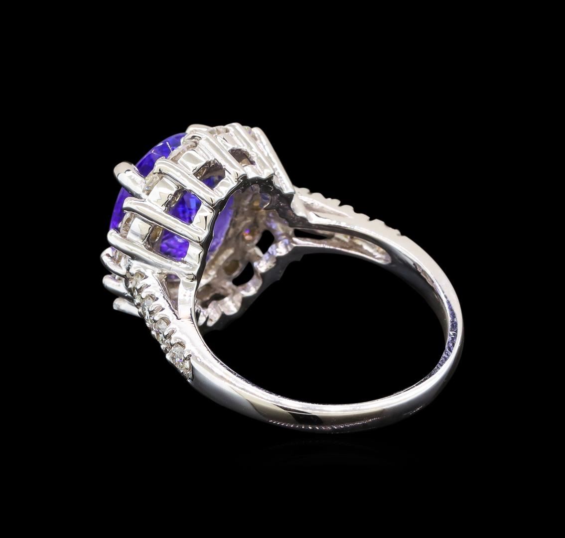 One electronically tested 14KT white gold ladies cast tanzanite and diamond ring with a bright polish finish. Identified with markings of "K14". Condition is new. Containing: One prong set oval modified brilliant cut natural tanzanite, measuring 11.10 x 8.90 x 5.50mm, approximate weight of 3.82ct., clarity is eye clean, type I, medium light, very slightly grayish, violet color, (GIA V 4/3), cut is good. Twenty-Two prong set round brilliant cut diamonds, measuring 2.30 - 2.00 x 1.29mm (depth est.) approximate total weight of 22 Stones = 0.80 ct. Clarity: SI-1 to I-1. Color: I - J, Cut is Good. Colored gemstones are presumed to have been subjected to commonly used enhancement processes. All diamonds and colored gemstones are graded in the mounting, unless otherwise stated. Total Weight of Colored Stones 3.82ct. Total Weight of Diamonds 0.80 ct. Total Weight of Ring 7.10 grams. GGL Appraised.