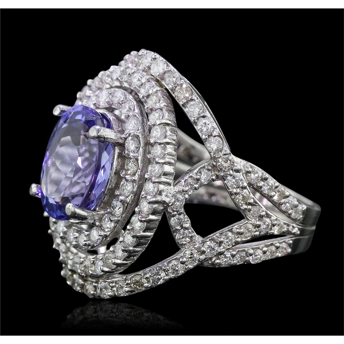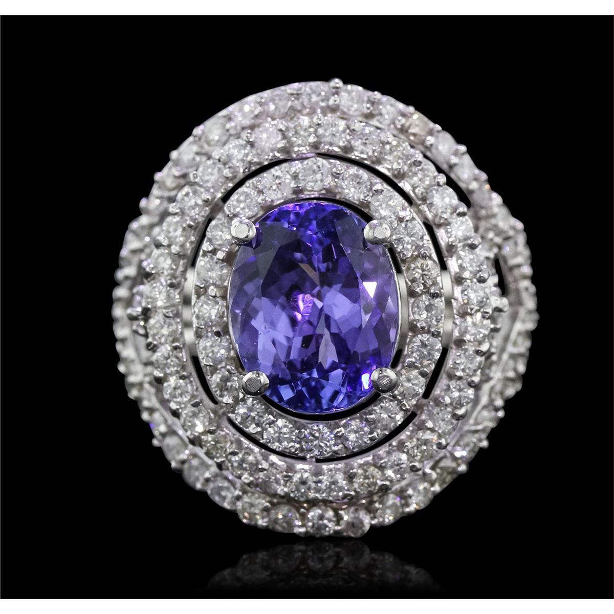 One electronically tested 14KT white gold Ladies combination cast & assembled ring with a bright polish finish. Condition is new. Identified with markings of "K14". Containing: One prong set oval modified brilliant cut natural tanzanite, measuring 10.90 x 8.80 x 5.87mm, approximate weight of 3.82ct., clarity is eye clean, type I, medium, moderately strong, bluish violet color, (GIA bV 5/4), cut is good. Colored gemstones are presumed to have been subjected to commonly used color/clarity enhancement processes. One Hundred Twenty-Nine prong set round brilliant cut diamonds, measuring 1.40 - 1.40 x 0.84mm (depth est.) approximate. Total Weight of 129 Stones = 1.29ct. Clarity: I-1 to I-2. Color: H - J, Cut is Good. Total Weight of Colored Stones 3.82ct. Total Weight of Diamonds 1.29ct. Total Weight of Ring 10.70 grams. GGL Appraised at $11,795.00.