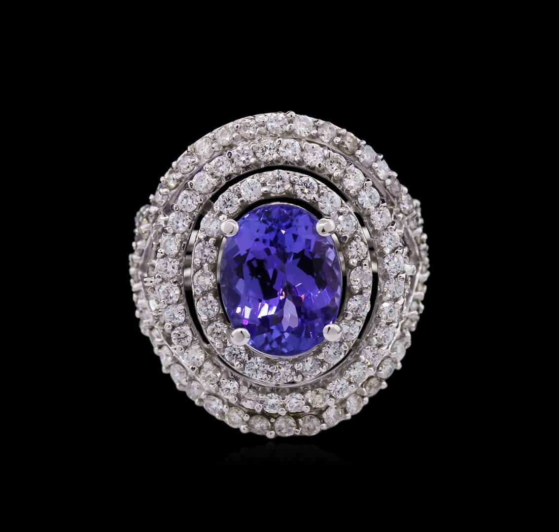 One electronically tested 14KT white gold Ladies combination cast & assembled ring with a bright polish finish. Condition is new. Identified with markings of "K14". Containing: One prong set oval modified brilliant cut natural tanzanite, measuring 10.90 x 8.80 x 5.87mm, approximate weight of 3.82ct., clarity is eye clean, type I, medium, moderately strong, bluish violet color, (GIA bV 5/4), cut is good. Colored gemstones are presumed to have been subjected to commonly used color/clarity enhancement processes. One Hundred Twenty-Nine prong set round brilliant cut diamonds, measuring 1.40 - 1.40 x 0.84mm (depth est.) approximate. Total Weight of 129 Stones = 1.29ct. Clarity: I-1 to I-2. Color: H - J, Cut is Good. Total Weight of Colored Stones 3.82ct. Total Weight of Diamonds 1.29ct. Total Weight of Ring 10.70 grams. GGL Appraised at $11,795.00.