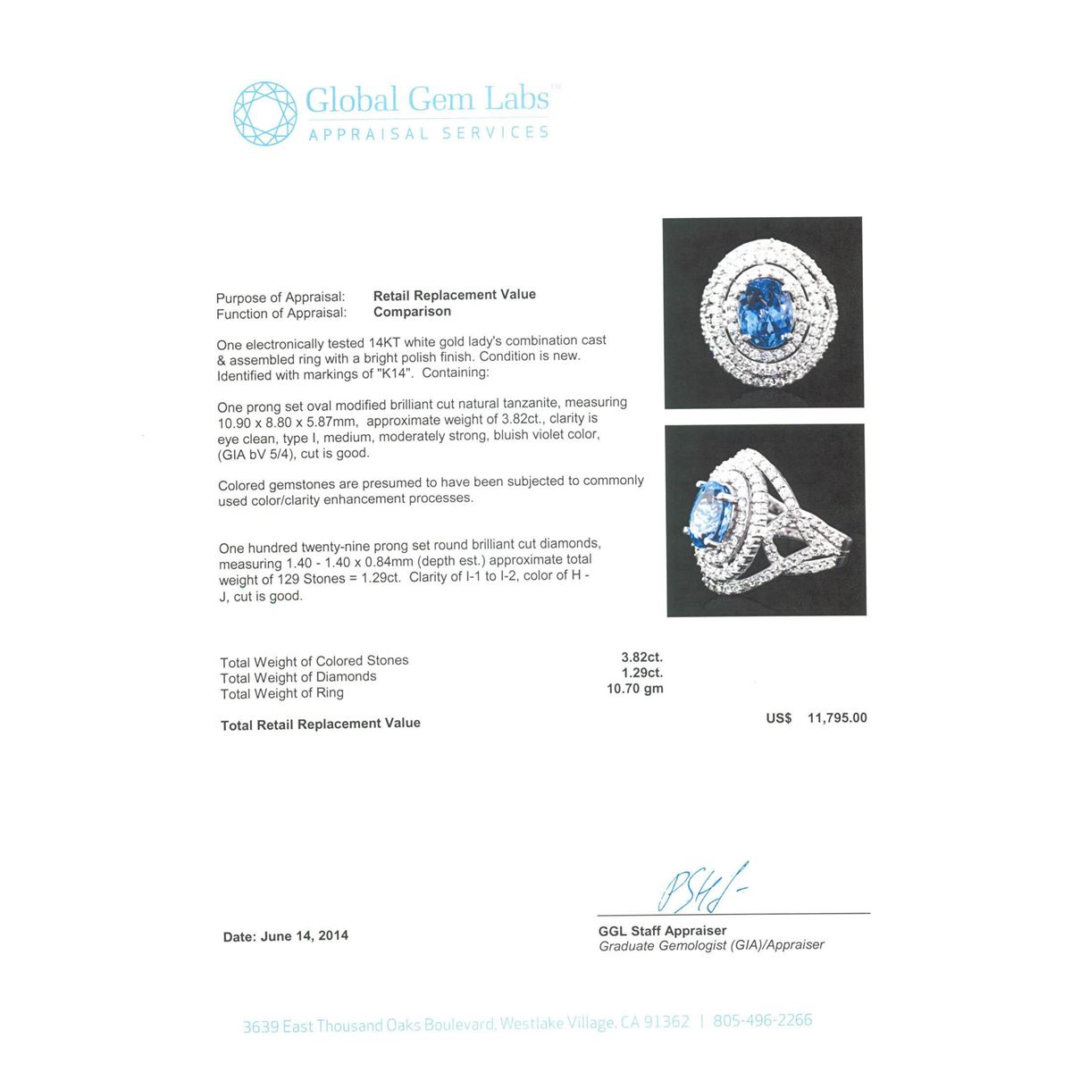 One electronically tested 14KT white gold Ladies combination cast & assembled ring with a bright polish finish. Condition is new. Identified with markings of "K14". Containing: One prong set oval modified brilliant cut natural tanzanite, measuring 10.90 x 8.80 x 5.87mm, approximate weight of 3.82ct., clarity is eye clean, type I, medium, moderately strong, bluish violet color, (GIA bV 5/4), cut is good. Colored gemstones are presumed to have been subjected to commonly used color/clarity enhancement processes. One Hundred Twenty-Nine prong set round brilliant cut diamonds, measuring 1.40 - 1.40 x 0.84mm (depth est.) approximate. Total Weight of 129 Stones = 1.29ct. Clarity: I-1 to I-2. Color: H - J, Cut is Good. Total Weight of Colored Stones 3.82ct. Total Weight of Diamonds 1.29ct. Total Weight of Ring 10.70 grams. GGL Appraised at $11,795.00.