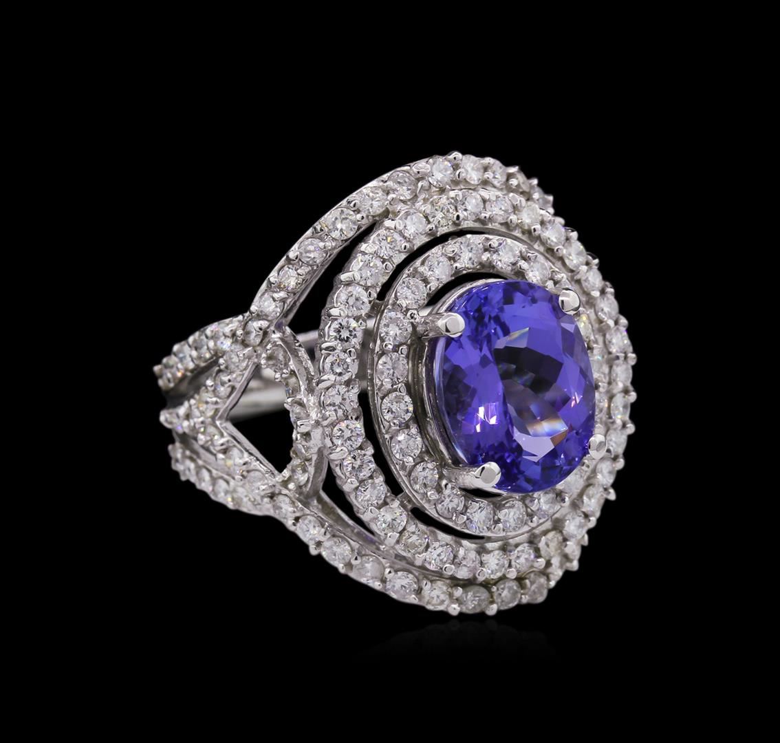 One electronically tested 14KT white gold Ladies combination cast & assembled ring with a bright polish finish. Condition is new. Identified with markings of "K14". Containing: One prong set oval modified brilliant cut natural tanzanite, measuring 10.90 x 8.80 x 5.87mm, approximate weight of 3.82ct., clarity is eye clean, type I, medium, moderately strong, bluish violet color, (GIA bV 5/4), cut is good. Colored gemstones are presumed to have been subjected to commonly used color/clarity enhancement processes. One Hundred Twenty-Nine prong set round brilliant cut diamonds, measuring 1.40 - 1.40 x 0.84mm (depth est.) approximate. Total Weight of 129 Stones = 1.29ct. Clarity: I-1 to I-2. Color: H - J, Cut is Good. Total Weight of Colored Stones 3.82ct. Total Weight of Diamonds 1.29ct. Total Weight of Ring 10.70 grams. GGL Appraised at $11,795.00.
