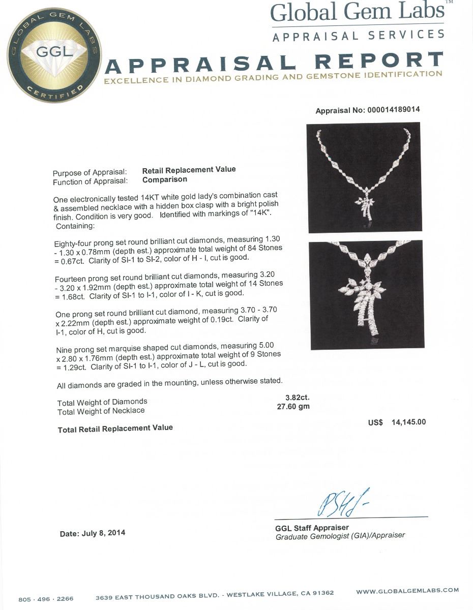 One electronically tested 14KT white gold Ladies combination cast & assembled necklace with a hidden box clasp with a bright polish finish. Condition is very good. Identified with markings of "14K". Containing: Eighty-Four prong set round brilliant cut diamonds, measuring 1.30 - 1.30 x 0.78mm (depth est.) approximate. Total Weight of 84 Stones = 0.67ct. Clarity: SI-1 to SI-2. Color: H - I, Cut is Good. Fourteen prong set round brilliant cut diamonds, measuring 3.20 - 3.20 x 1.92mm (depth est.) approximate. Total Weight of 14 Stones = 1.68ct. Clarity: SI-1 to I-1. Color: I - K, Cut is Good. One prong set round brilliant cut diamond, measuring 3.70 - 3.70 x 2.22mm (depth est.) approximate weight of 0.19ct. Clarity: I-1. Color: H, Cut is Good. Nine prong set marquise shaped cut diamonds, measuring 5.00 x 2.80 x 1.76mm (depth est.) approximate. Total Weight of 9 Stones = 1.29ct. Clarity: SI-1 to I-1. Color: J - L, Cut is Good. All diamonds are graded in the mounting, unless otherwise stated. Total Weight of Diamonds 3.82ct. Total Weight of Necklace 27.60 grams. GGL Appraised at $14,145.00.