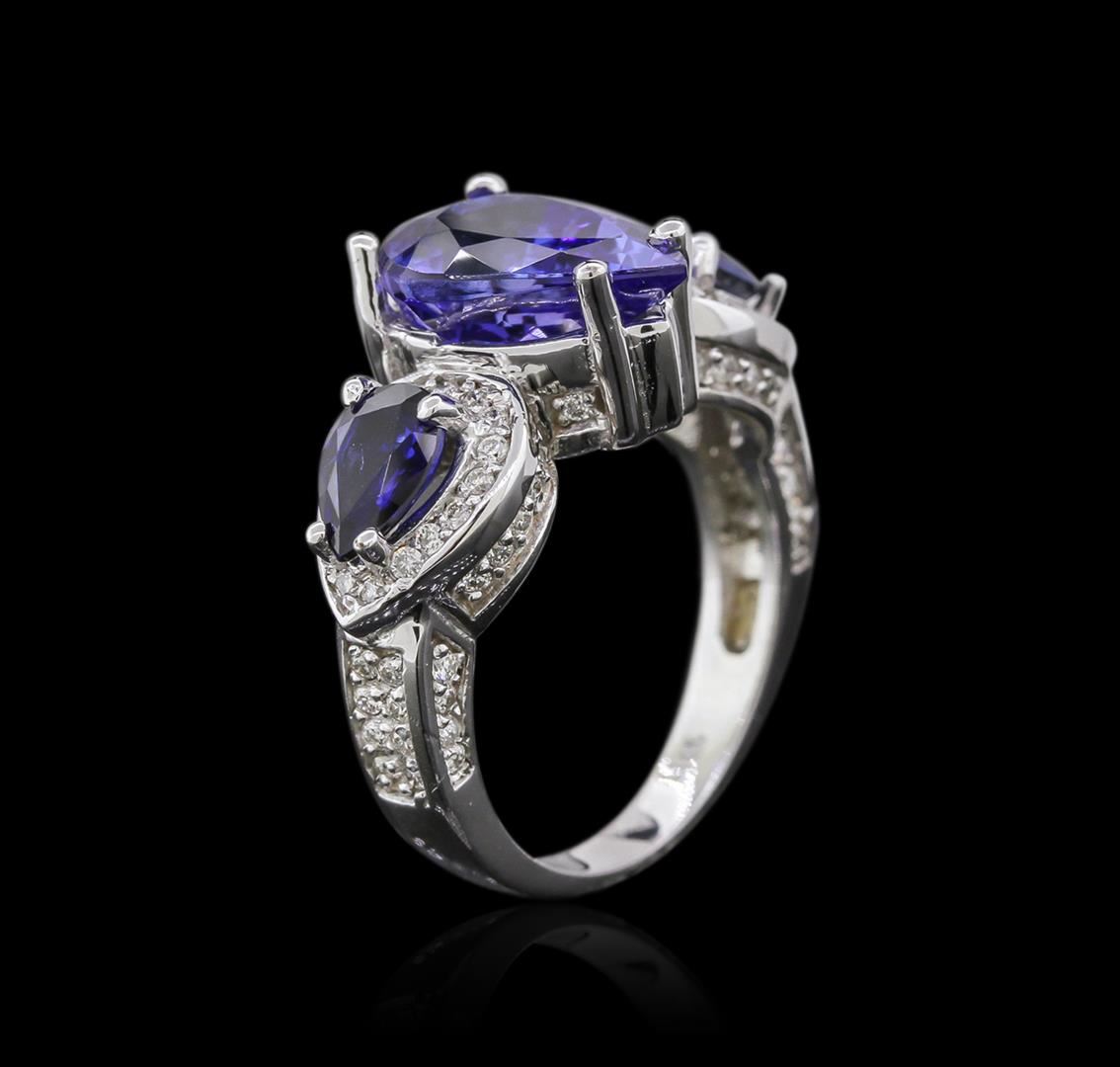 One electronically tested 14KT white gold ladies cast tanzanite, sapphire and diamond ring with a bright polish finish. Identified with markings of "14K". Condition is new. Containing: One prong set pear modified brilliant cut natural tanzanite, measuring 12.10 x 8.80 x 5.72mm, approximate weight of 3.83ct., clarity is eye clean, type I, medium, moderately strong, bluish violet color, (GIA bV 5/4), cut is good. Two prong set pear modified brilliant cut natural blue sapphires, measuring 6.80 x 4.90 x 3.19mm, approximate total weight of 1.41ct., clarity is eye clean, type II, medium, moderately strong, blue color, (GIA B 5/4), cut is good. Ninety prong set round brilliant cut diamonds, measuring 1.00 - 1.00 x 0.60mm (depth est.) approximate total weight of 90 Stones = 0.32ct. Clarity: SI-1 to SI-2. Color: H - I, Cut is Good. Colored gemstones are presumed to have been subjected to commonly used enhancement processes. All diamonds and colored gemstones are graded in the mounting, unless otherwise stated. Total Weight of Colored Stones 5.24ct. Total Weight of Diamonds 0.32ct. Total Weight of Ring 7.50 grams. GGL Appraised at $5,485.00.