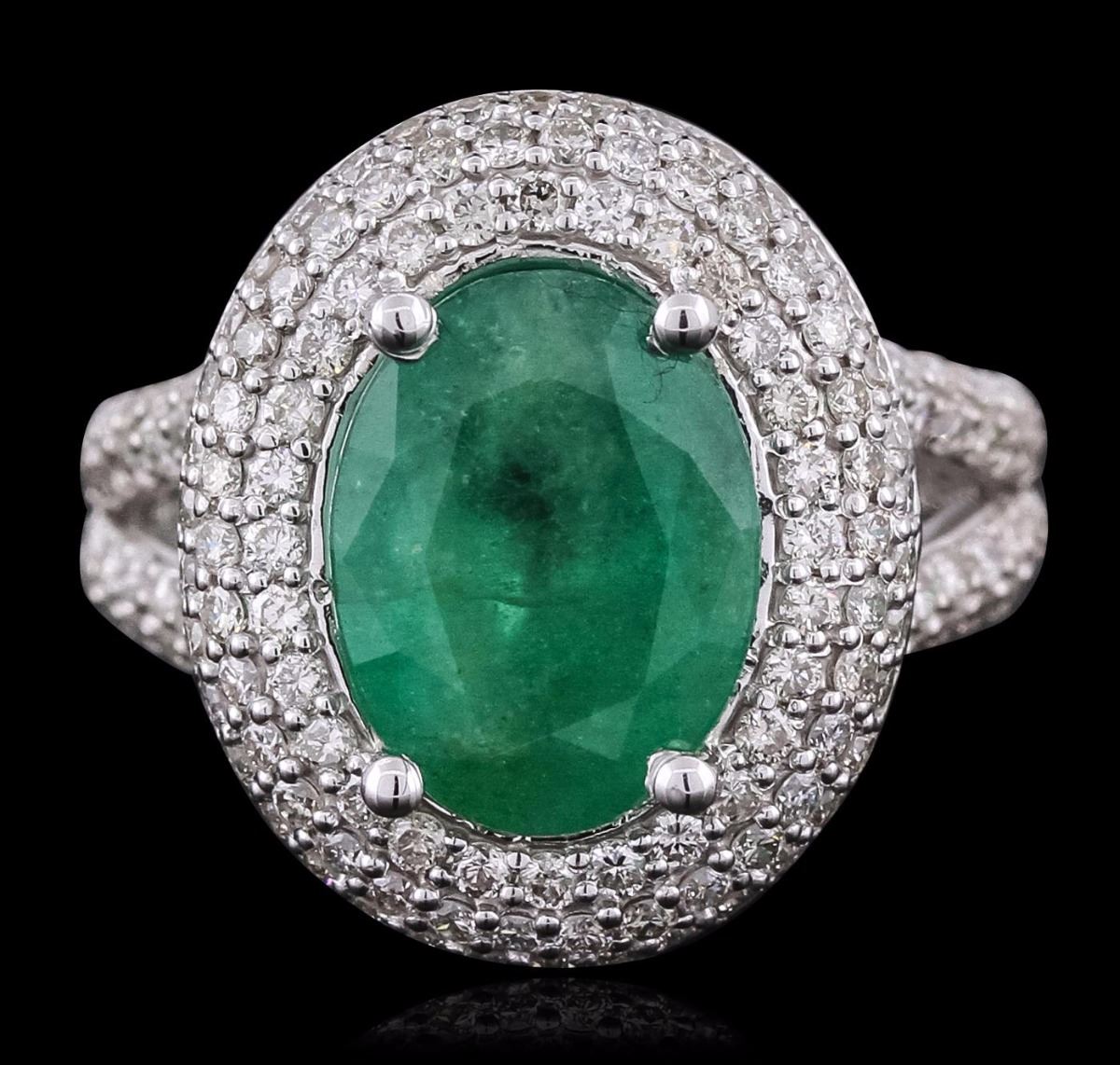 One electronically tested 14KT white gold ladies combination cast & assembled ring with a bright polish finish. Condition is new. Identified with markings of "14K". Containing: One prong set oval modified brilliant cut natural emerald, measuring 12.40 x 9.00 x 6.17mm, approximate weight of 3.84ct., clarity is heavily included, type III, medium dark, moderately strong, green color, (GIA G 6/4), cut is good. One Hundred Fifty-Six prong set round brilliant cut diamonds, measuring 1.30 - 1.30 x 0.78mm (depth est.) approximate total weight of 156 Stones = 1.25ct. Clarity: I-1 to I-2. Color: I - J, Cut is Good. Colored gemstones are presumed to have been subjected to commonly used enhancement processes. All diamonds and colored gemstones are graded in the mounting, unless otherwise stated. Total Weight of Colored Stones 3.84ct. Total Weight of Diamonds 1.25ct. Total Weight of Ring 7.10 grams. GGL Appraised at $11,985.00.