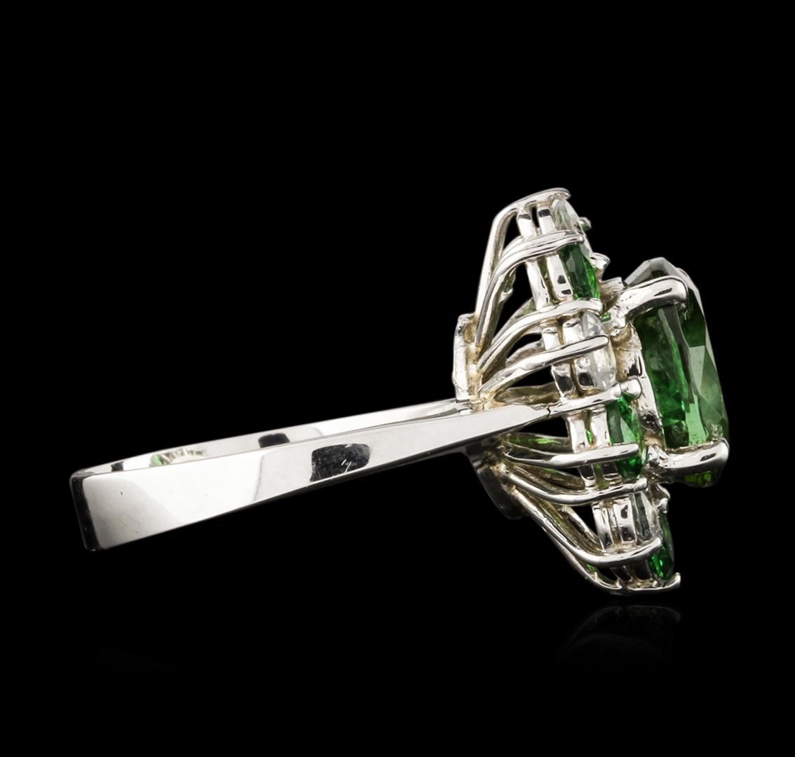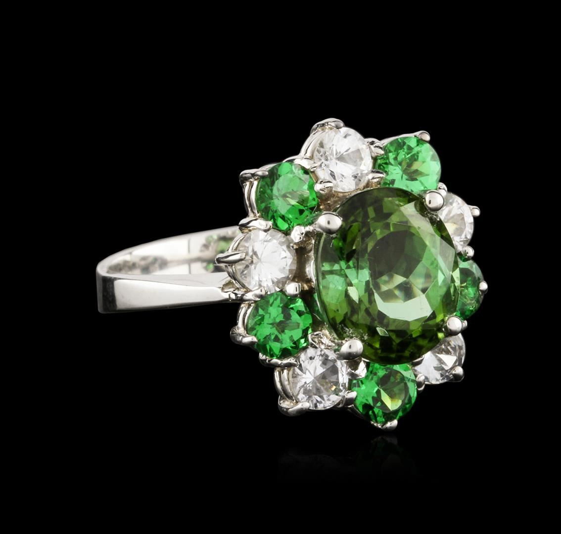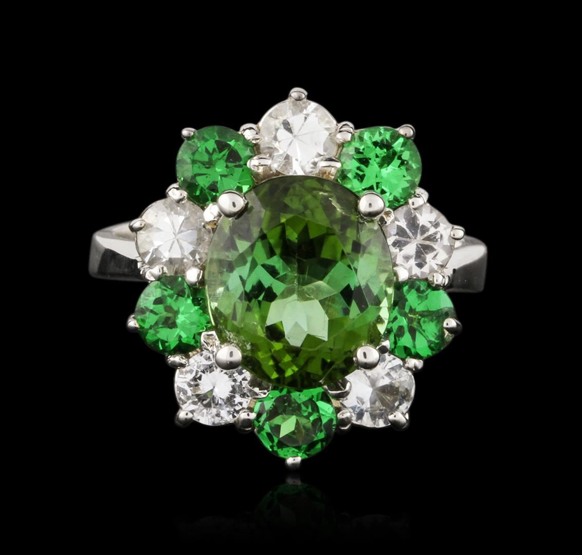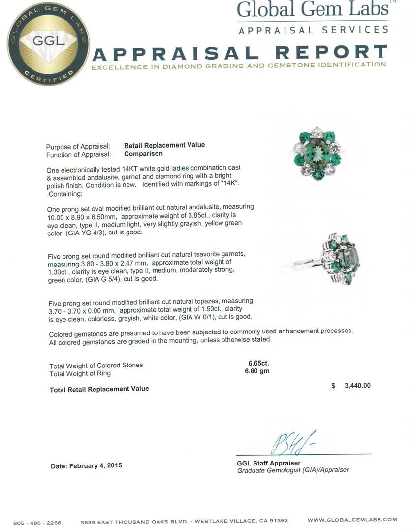One electronically tested 14KT white gold ladies combination cast & assembled andalusite, garnet and diamond ring with a bright polish finish. Identified with markings of "14K". Condition is new. Containing: One prong set oval modified brilliant cut natural andalusite, measuring 10.00 x 8.90 x 6.50mm, approximate weight of 3.85ct., clarity is eye clean, type II, medium light, very slightly grayish, yellow green color, (GIA YG 4/3), cut is good. Five prong set round modified brilliant cut natural tsavorite garnets, measuring 3.80 - 3.80 x 2.47 mm, approximate total weight of 1.30ct., clarity is eye clean, type II, medium, moderately strong, green color, (GIA G 5/4), cut is good. Five prong set round modified brilliant cut natural topaz's, measuring 3.70 - 3.70 x 0.00 mm, approximate total weight of 1.50ct., clarity is eye clean, colorless, grayish, white color, (GIA W 0/1), cut is good. Colored gemstones are presumed to have been subjected to commonly used enhancement processes. All colored gemstones are graded in the mounting, unless otherwise stated. Total Weight of Colored Stones 6.65ct. Total Weight of Ring 6.60 grams. GGL Appraised at $3,440.00.