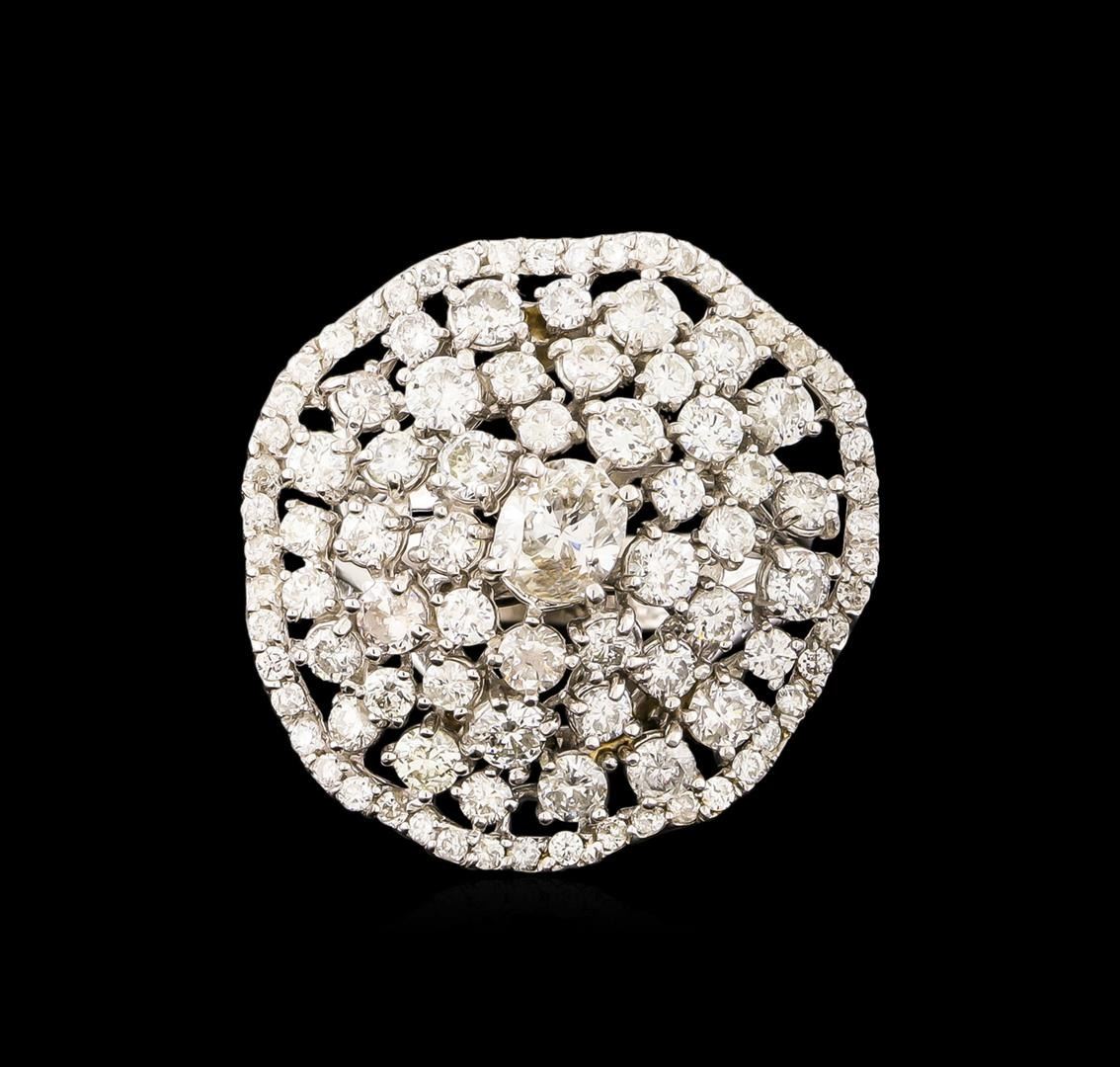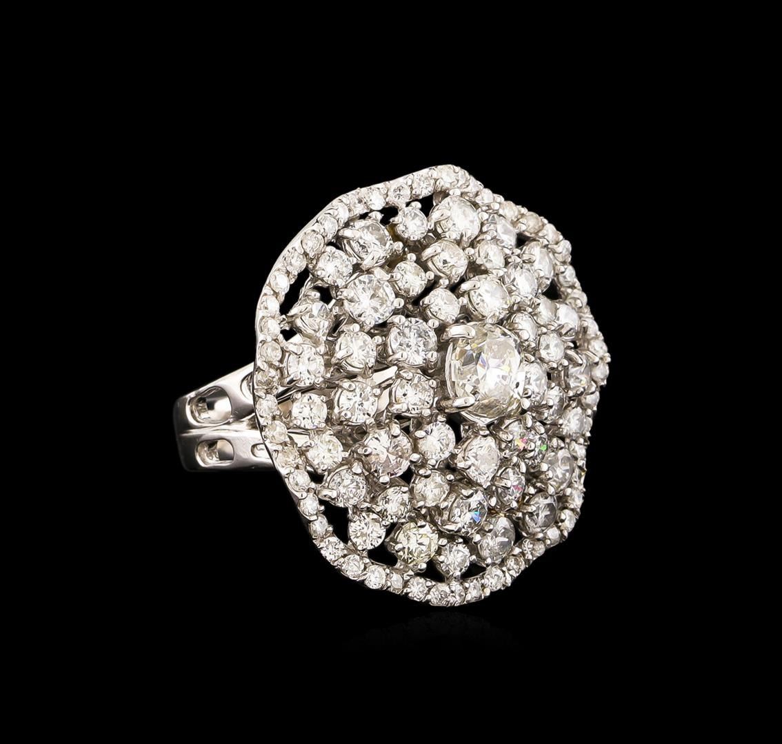 One electronically tested 14KT white gold ladies cast diamond ring with a bright polish finish. The featured diamond is set within a stylized diamond cluster, completed by a three and one-half millimeter wide band. Identified with markings of "585". Condition is new, good workmanship. Containing: One prong set oval shaped cut diamond, measuring 5.60 x 5.20 x 3.60mm (depth est.) approximate weight of 0.70ct. Graded in the setting. Clarity: I-1 . Color: H Forty-Four prong set round brilliant cut diamonds, measuring 2.90 - 2.10 x 1.50mm (depth est.) approximate total weight of 44 Stones = 2.61ct. Graded in the setting. Clarity: SI-1 to I-1 . Color: G - I Fifty prong set round brilliant cut diamonds, measuring 1.40 - 1.30 x 0.81mm (depth est.) approximate total weight of 50 Stones = 0.55ct. Graded in the setting. Clarity: SI-1 to I-1 . Color: G - I. Total Weight of Diamonds 3.86ct. Total Weight of Ring 9.58 grams. AIG Appraised at $15,290.00.