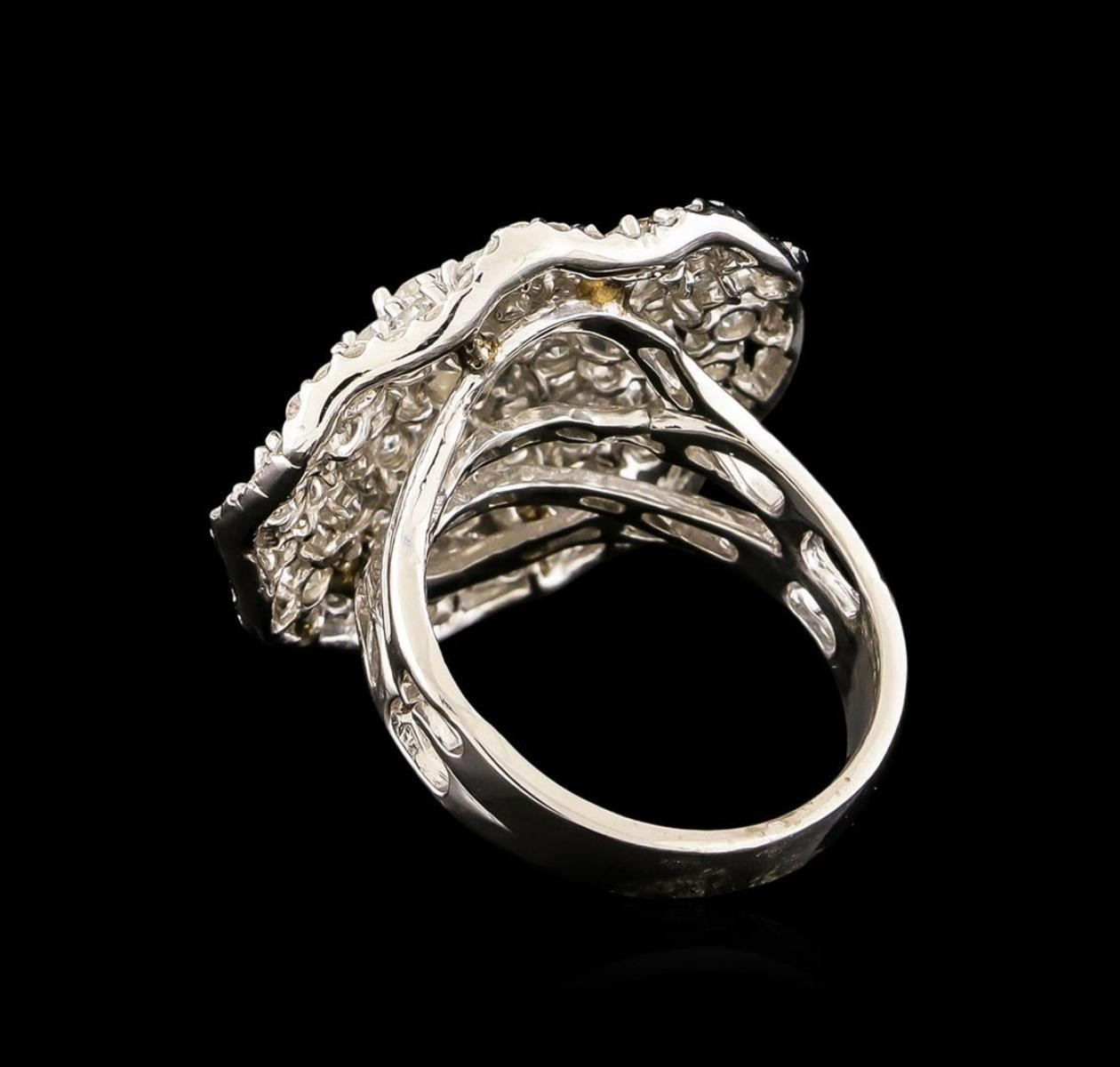 One electronically tested 14KT white gold ladies cast diamond ring with a bright polish finish. The featured diamond is set within a stylized diamond cluster, completed by a three and one-half millimeter wide band. Identified with markings of "585". Condition is new, good workmanship. Containing: One prong set oval shaped cut diamond, measuring 5.60 x 5.20 x 3.60mm (depth est.) approximate weight of 0.70ct. Graded in the setting. Clarity: I-1 . Color: H Forty-Four prong set round brilliant cut diamonds, measuring 2.90 - 2.10 x 1.50mm (depth est.) approximate total weight of 44 Stones = 2.61ct. Graded in the setting. Clarity: SI-1 to I-1 . Color: G - I Fifty prong set round brilliant cut diamonds, measuring 1.40 - 1.30 x 0.81mm (depth est.) approximate total weight of 50 Stones = 0.55ct. Graded in the setting. Clarity: SI-1 to I-1 . Color: G - I. Total Weight of Diamonds 3.86ct. Total Weight of Ring 9.58 grams. AIG Appraised.