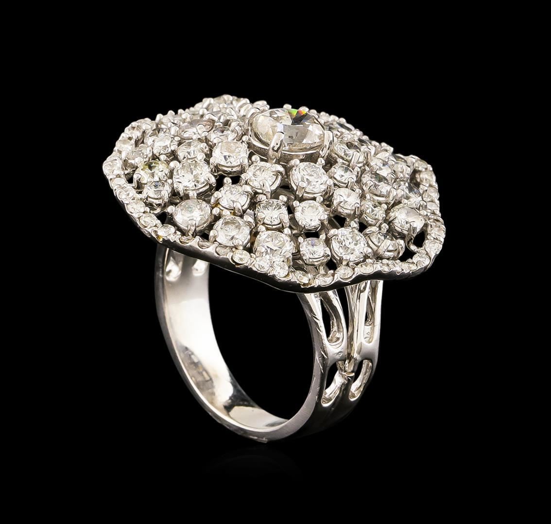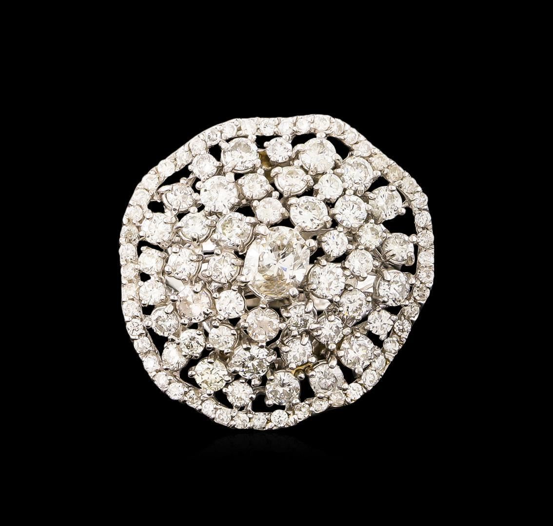 One electronically tested 14KT white gold ladies cast diamond ring with a bright polish finish. The featured diamond is set within a stylized diamond cluster, completed by a three and one-half millimeter wide band. Identified with markings of "585". Condition is new, good workmanship. Containing: One prong set oval shaped cut diamond, measuring 5.60 x 5.20 x 3.60mm (depth est.) approximate weight of 0.70 ct. Graded in the setting. Clarity: I-1 . Color: H Forty-Four prong set round brilliant cut diamonds, measuring 2.90 - 2.10 x 1.50mm (depth est.) approximate total weight of 44 Stones = 2.61ct. Graded in the setting. Clarity: SI-1 to I-1 . Color: G - I Fifty prong set round brilliant cut diamonds, measuring 1.40 - 1.30 x 0.81mm (depth est.) approximate total weight of 50 Stones = 0.55ct. Graded in the setting. Clarity: SI-1 to I-1 . Color: G - I. Total Weight of Diamonds 3.86ct. Total Weight of Ring 9.58 grams. AIG Appraised.