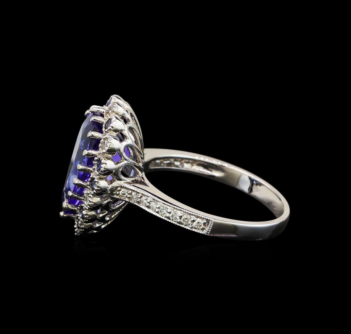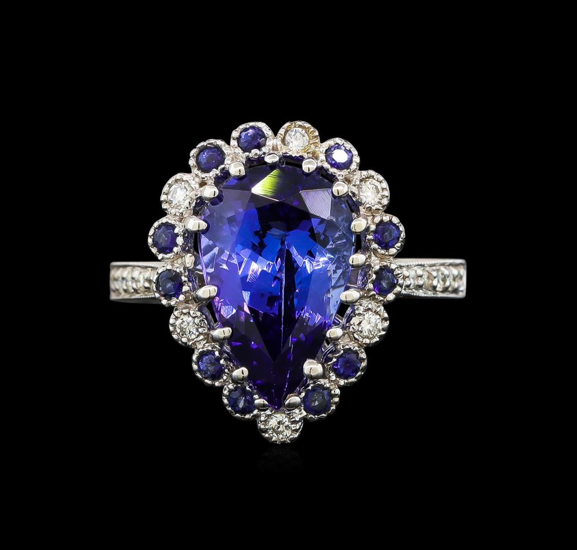 One electronically tested 14KT white gold ladies cast tanzanite, sapphire and diamond ring with a cathedral shank with a bright polish finish. Trademark is Orianne. Identified with markings of "14K". Condition is new. Containing: One prong set pear modified brilliant cut natural tanzanite, measuring 13.11 x 7.51 x 5.85mm, approximate weight of 3.86ct., clarity is eye clean, type I, medium light, very slightly grayish, bluish violet color, (GIA bV 4/3), cut is good. Twelve prong set round modified brilliant cut natural blue sapphires, measuring 2.00 - 2.00 x 1.30 mm, approximate total weight of 0.48ct., clarity is moderately included, type II, medium, moderately strong, blue color, (GIA B 5/4), cut is good. Twenty-Two prong set round brilliant cut diamonds, measuring 1.10 - 1.10 x 0.66mm (depth est.) approximate total weight of 22 Stones = 0.11ct. Clarity: I-1 to I-2. Color: I - J. All diamonds and colored gemstones are graded in the mounting, unless otherwise stated. Colored gemstones are presumed to have been subjected to commonly used enhancement processes. Total Weight of Colored Stones 4.34ct. Total Weight of Diamonds 0.11ct. Total Weight of Ring 5.10 grams. GGL Appraised at $4,260.00.