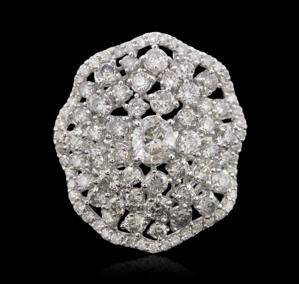 One electronically tested 14KT white gold ladies cast diamond ring with a bright polish finish. The featured diamond is set within a stylized diamond cluster, completed by a three and one-half millimeter wide band. Identified with markings of "585". Condition is new, good workmanship. Containing: One prong set oval shaped cut diamond, measuring 5.60 x 5.20 x 3.60mm (depth est.) approximate weight of 0.70ct. Graded in the setting. Clarity: I-1 . Color: H Forty-Four prong set round brilliant cut diamonds, measuring 2.90 - 2.10 x 1.50mm (depth est.) approximate total weight of 44 Stones = 2.61ct. Graded in the setting. Clarity: SI-1 to I-1 . Color: G - I Fifty prong set round brilliant cut diamonds, measuring 1.40 - 1.30 x 0.81mm (depth est.) approximate total weight of 50 Stones = 0.55ct. Graded in the setting. Clarity: SI-1 to I-1 . Color: G - I. Total Weight of Diamonds 3.86ct. Total Weight of Ring 9.58 grams. AIG Appraised at $15,290.00.