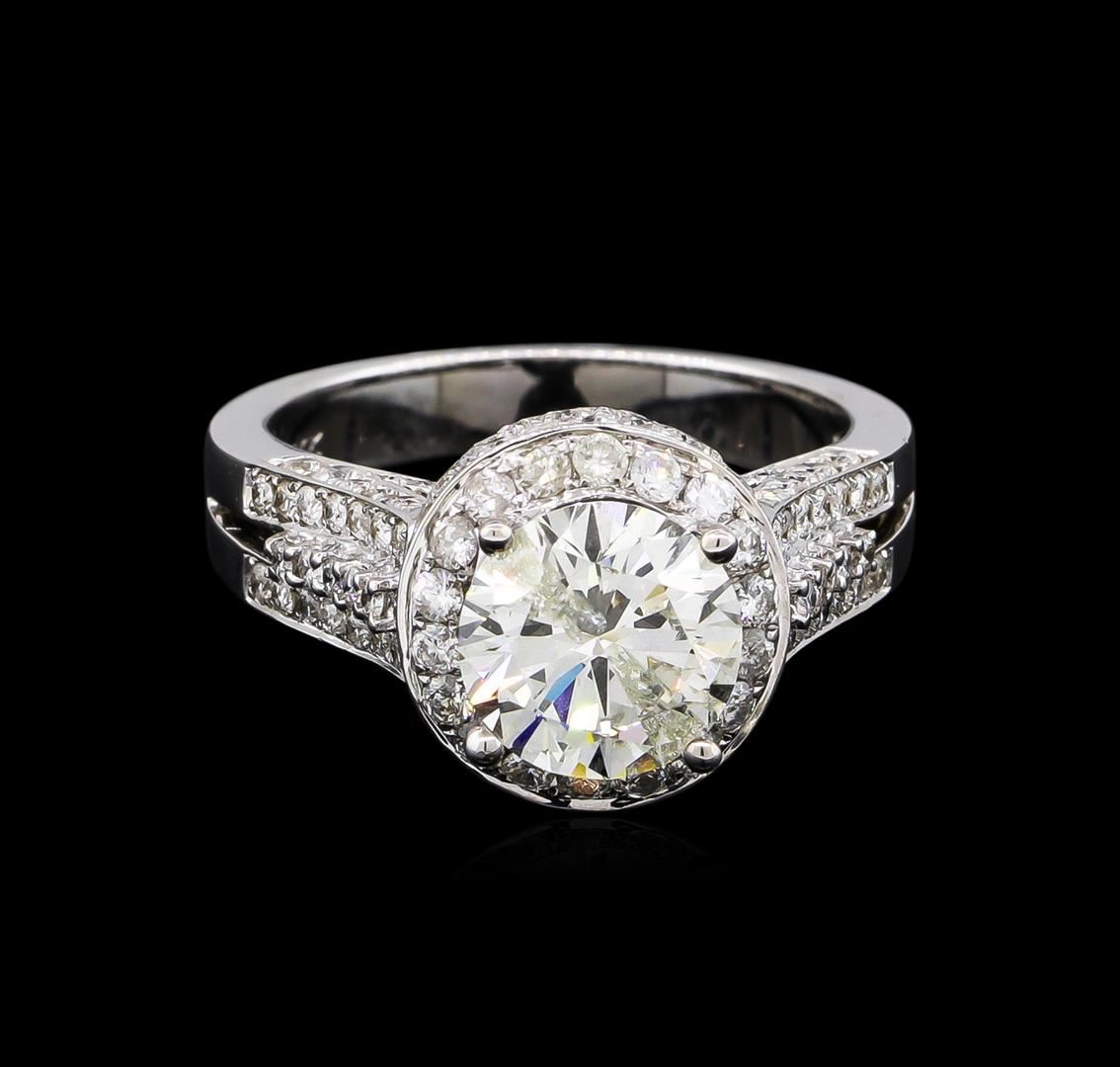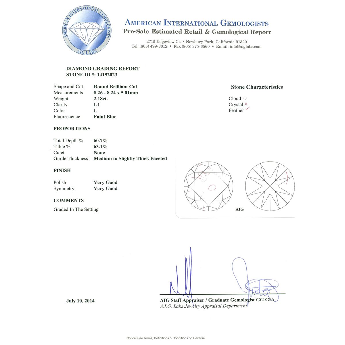 One electronically tested 14KT white gold ladies cast diamond unity ring with a bright polish finish. Condition is new, good workmanship. The featured diamond is set within a diamond bezel supported by an elaborate diamond set under gallery and diamond set shoulders, completed by a three millimeter wide band. Identified with markings of "14K". Containing: One prong set round brilliant cut diamond, measuring 8.26 - 8.24 x 5.01mm approximate weight of 2.18ct with a faint blue fluorescence. Diamond Grading Report attached. Graded in the setting. Clarity: I-1. Color: Depth 60.7%. Table 63.1%. One Hundred Fifty-Four bead set round brilliant cut diamonds, measuring 1.80 - 1.30 x 0.93mm (depth est.) approximate. Total Weight of 154 Stones = 1.69ct. Graded in the setting. Clarity: I-1 to I-2. Color: G - I. Total Weight of Diamonds 3.87ct. Total Weight of Unity Ring 7.09 grams. AIG Appraised at $37,575.00.