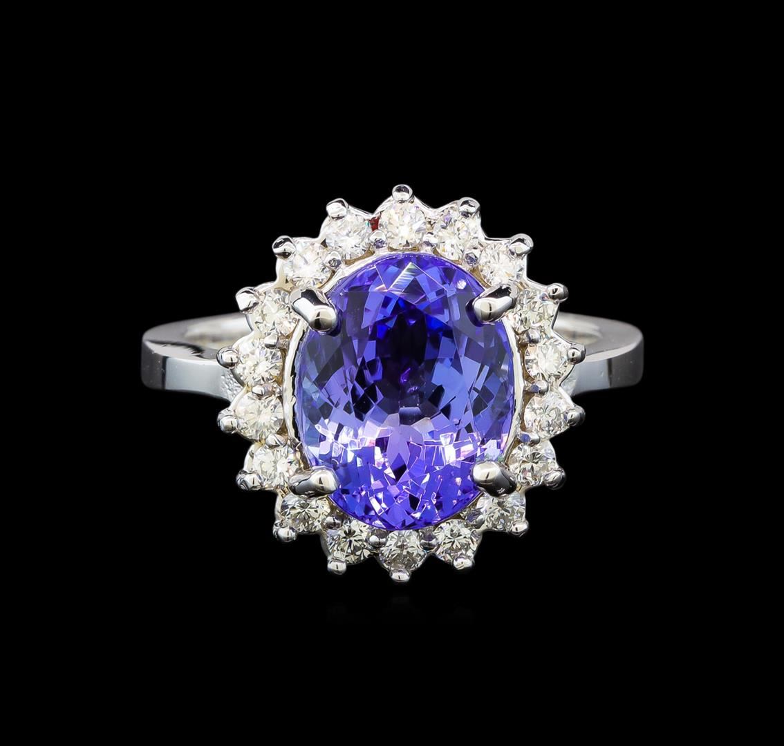 One electronically tested 14KT white gold ladies cast tanzanite and diamond ring with a bright polish finish. Identified with markings of "K14". Condition is new. Containing: One prong set oval modified brilliant cut natural tanzanite, measuring 11.00. x 8.00. x 6.25mm, approximate weight of 3.87ct., clarity is eye clean, type I, medium, very slightly grayish, violet color, (GIA V 5/3), cut is good. Eighteen prong set round brilliant cut diamonds, measuring 2.00. - 2.00. x 1.20mm (depth est.) approximate total weight of 18 Stones = 0.53ct. Clarity: SI-1 to SI-2. Color: H - I, Cut is Good. Colored gemstones are presumed to have been subjected to commonly used enhancement processes. All diamonds and colored gemstones are graded in the mounting, unless otherwise stated. Total Weight of Colored Stones 3.87ct. Total Weight of Diamonds 0.53ct. Total Weight of Ring 6.20 grams. GGL Appraised at $5,225.00.