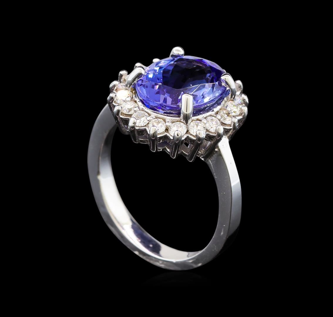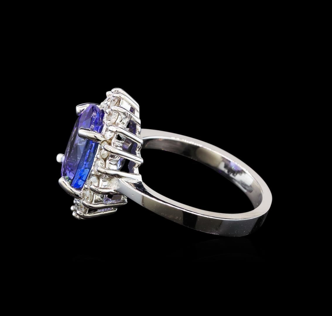 One electronically tested 14KT white gold ladies cast tanzanite and diamond ring with a bright polish finish. Identified with markings of "K14". Condition is new. Containing: One prong set oval modified brilliant cut natural tanzanite, measuring 11.00. x 8.00. x 6.25mm, approximate weight of 3.87ct., clarity is eye clean, type I, medium, very slightly grayish, violet color, (GIA V 5/3), cut is good. Eighteen prong set round brilliant cut diamonds, measuring 2.00. - 2.00. x 1.20mm (depth est.) approximate total weight of 18 Stones = 0.53ct. Clarity: SI-1 to SI-2. Color: H - I, Cut is Good. Colored gemstones are presumed to have been subjected to commonly used enhancement processes. All diamonds and colored gemstones are graded in the mounting, unless otherwise stated. Total Weight of Colored Stones 3.87ct. Total Weight of Diamonds 0.53ct. Total Weight of Ring 6.20 grams. GGL Appraised at $5,225.00.