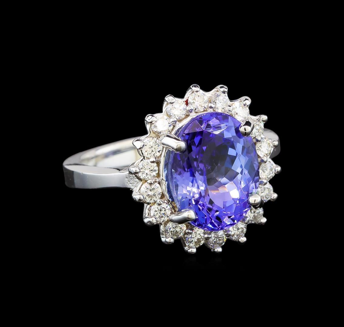 One electronically tested 14KT white gold ladies cast tanzanite and diamond ring with a bright polish finish. Identified with markings of "K14". Condition is new. Containing: One prong set oval modified brilliant cut natural tanzanite, measuring 11.00. x 8.00. x 6.25mm, approximate weight of 3.87ct., clarity is eye clean, type I, medium, very slightly grayish, violet color, (GIA V 5/3), cut is good. Eighteen prong set round brilliant cut diamonds, measuring 2.00. - 2.00. x 1.20mm (depth est.) approximate total weight of 18 Stones = 0.53ct. Clarity: SI-1 to SI-2. Color: H - I, Cut is Good. Colored gemstones are presumed to have been subjected to commonly used enhancement processes. All diamonds and colored gemstones are graded in the mounting, unless otherwise stated. Total Weight of Colored Stones 3.87ct. Total Weight of Diamonds 0.53ct. Total Weight of Ring 6.20 grams. GGL Appraised at $5,225.00.