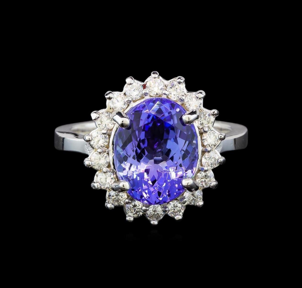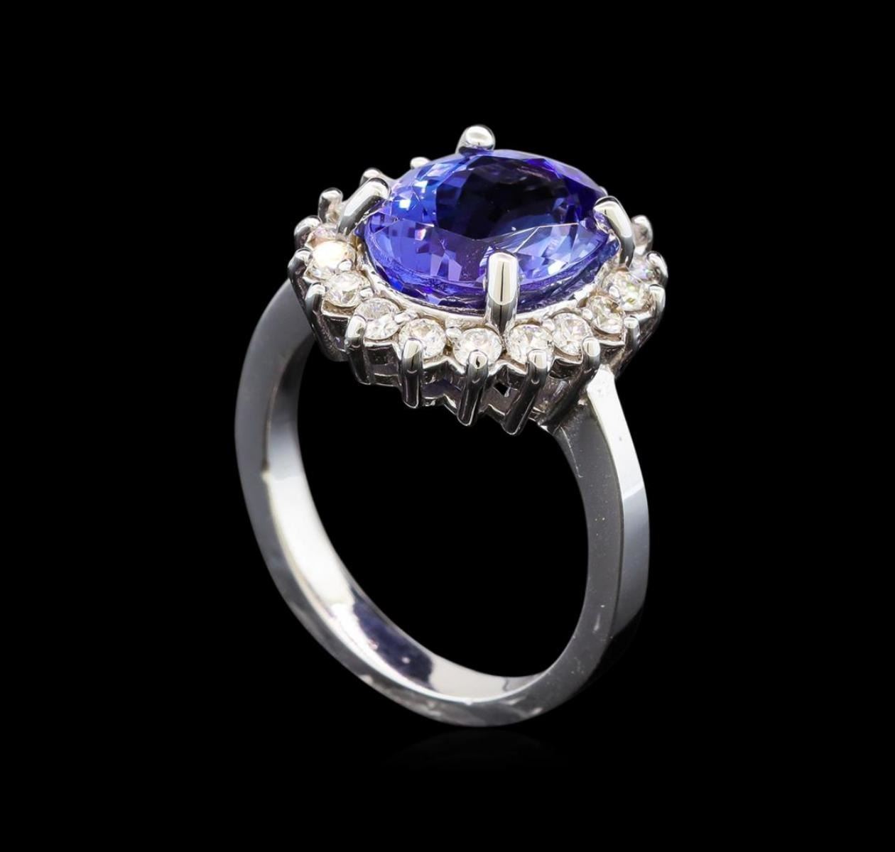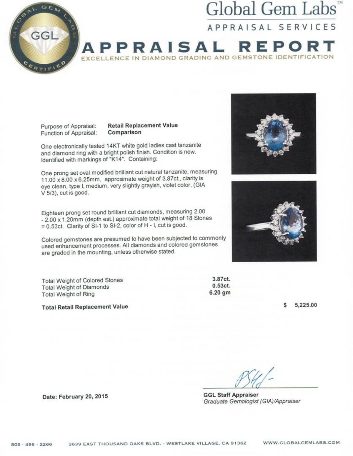 One electronically tested 14KT white gold ladies cast tanzanite and diamond ring with a bright polish finish. Identified with markings of "K14". Condition is new. Containing: One prong set oval modified brilliant cut natural tanzanite, measuring 11.00. x 8.00. x 6.25mm, approximate weight of 3.87ct., clarity is eye clean, type I, medium, very slightly grayish, violet color, (GIA V 5/3), cut is good. Eighteen prong set round brilliant cut diamonds, measuring 2.00. - 2.00. x 1.20mm (depth est.) approximate total weight of 18 Stones = 0.53ct. Clarity: SI-1 to SI-2. Color: H - I, Cut is Good. Colored gemstones are presumed to have been subjected to commonly used enhancement processes. All diamonds and colored gemstones are graded in the mounting, unless otherwise stated. Total Weight of Colored Stones 3.87ct. Total Weight of Diamonds 0.53ct. Total Weight of Ring 6.20 grams. GGL Appraised.