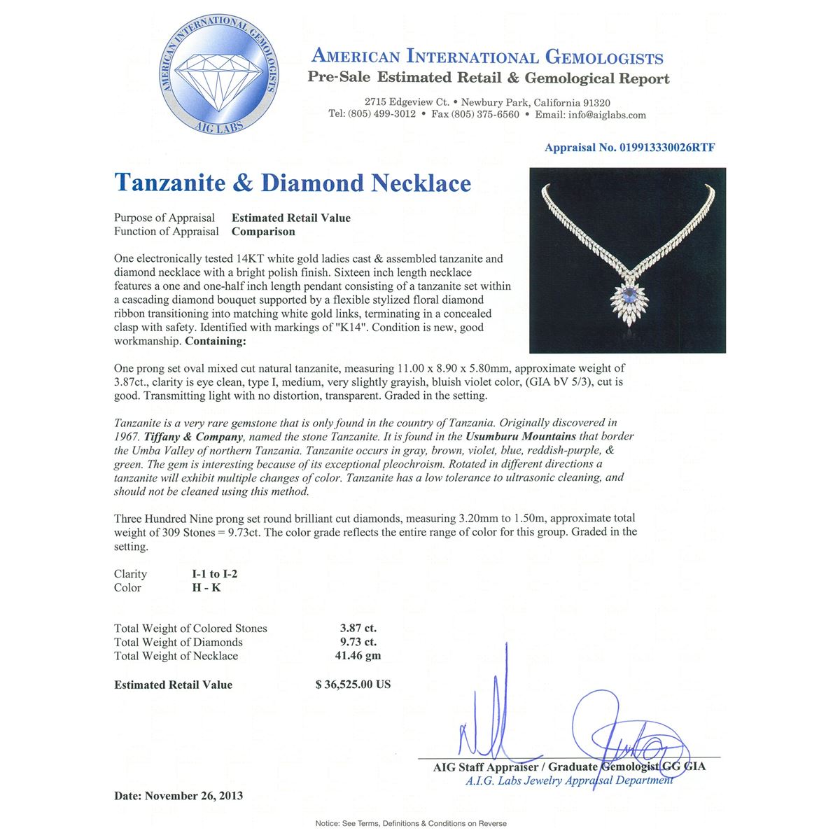 One electronically tested 14KT white gold ladies cast & assembled tanzanite and diamond necklace with a bright polish finish. Sixteen inch length necklace features a one and one-half inch length pendant consisting of a tanzanite set within a cascading diamond bouquet supported by a flexible stylized floral diamond ribbon transitioning into matching white gold links, terminating in a concealed clasp with safety. Identified with markings of "K14". Condition is new, good workmanship. Containing: One prong set oval mixed cut natural tanzanite, measuring 11.00 x 8.90 x 5.80mm, approximate weight of 3.87ct., clarity is eye clean, type I, medium, very slightly grayish, bluish violet color, (GIA bV 5/3), cut is good. Transmitting light with no distortion, transparent. Graded in the setting. Tanzanite is a very rare gemstone that is only found in the country of Tanzania. Originally discovered in 1967. Tiffany & Company, named the stone Tanzanite. It is found in the Usumburu Mountains that border the Umba Valley of northern Tanzania. Tanzanite occurs in gray, brown, violet, blue, reddish-purple, & green. The gem is interesting because of its exceptional pleochroism. Rotated in different directions a tanzanite will exhibit multiple changes of color. Tanzanite has a low tolerance to ultrasonic cleaning, and should not be cleaned using this method. Three Hundred Nine prong set round brilliant cut diamonds, measuring 3.20mm to 1.50m, approximate total weight of 309 Stones = 9.73ct. The color grade reflects the entire range of color for this group. Graded in the setting. Clarity I-1 to 1-2. Color H -- K. Total Weight of Colored Stones 3.87ct. Total Weight of Diamonds 9.73ct. Total Weight of Necklace 41.46gm. AIG Appraised at $36,525.00.