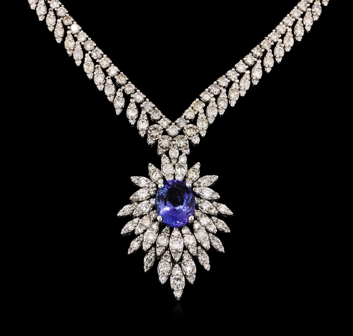 One electronically tested 14KT white gold ladies cast & assembled tanzanite and diamond necklace with a bright polish finish. Sixteen inch length necklace features a one and one-half inch length pendant consisting of a tanzanite set within a cascading diamond bouquet supported by a flexible stylized floral diamond ribbon transitioning into matching white gold links, terminating in a concealed clasp with safety. Identified with markings of "K14". Condition is new, good workmanship. Containing: One prong set oval mixed cut natural tanzanite, measuring 11.00 x 8.90 x 5.80mm, approximate weight of 3.87ct., clarity is eye clean, type I, medium, very slightly grayish, bluish violet color, (GIA bV 5/3), cut is good. Transmitting light with no distortion, transparent. Graded in the setting. Tanzanite is a very rare gemstone that is only found in the country of Tanzania. Originally discovered in 1967. Tiffany & Company, named the stone Tanzanite. It is found in the Usumburu Mountains that border the Umba Valley of northern Tanzania. Tanzanite occurs in gray, brown, violet, blue, reddish-purple, & green. The gem is interesting because of its exceptional pleochroism. Rotated in different directions a tanzanite will exhibit multiple changes of color. Tanzanite has a low tolerance to ultrasonic cleaning, and should not be cleaned using this method. Three Hundred Nine prong set round brilliant cut diamonds, measuring 3.20mm to 1.50m, approximate total weight of 309 Stones = 9.73ct. The color grade reflects the entire range of color for this group. Graded in the setting. Clarity I-1 to 1-2. Color H -- K. Total Weight of Colored Stones 3.87ct. Total Weight of Diamonds 9.73ct. Total Weight of Necklace 41.46gm. AIG Appraised at $36,525.00.