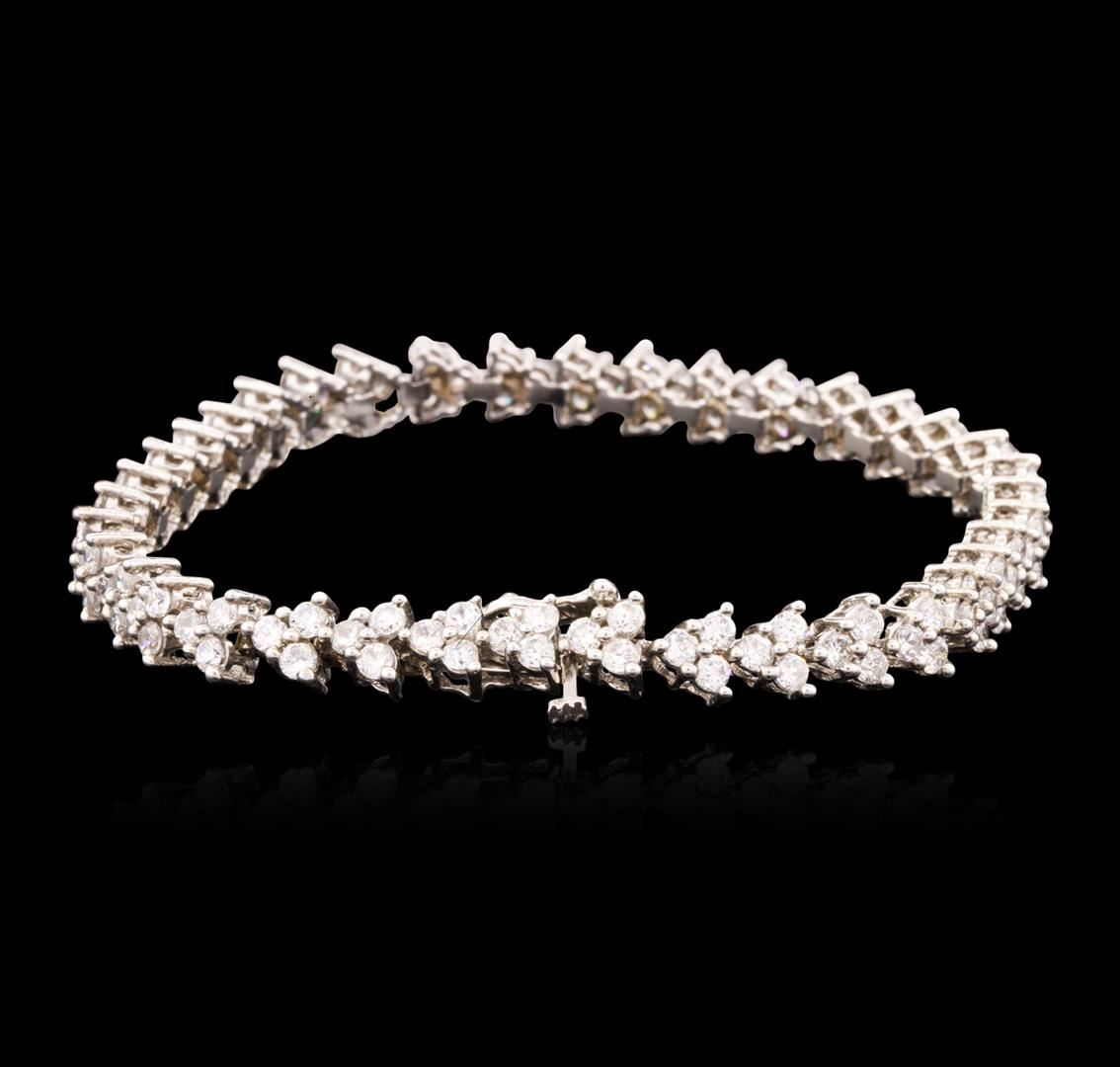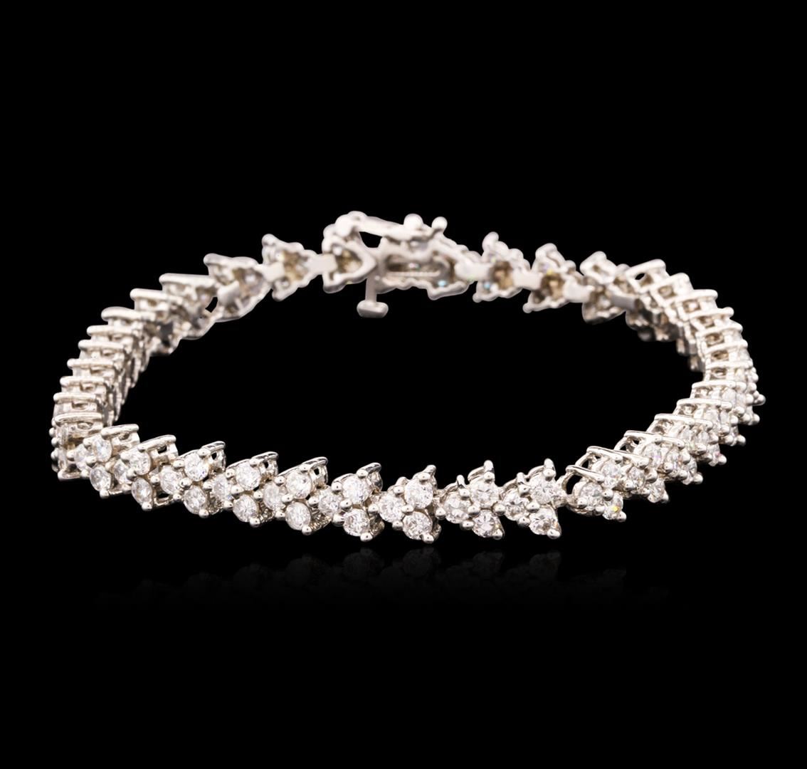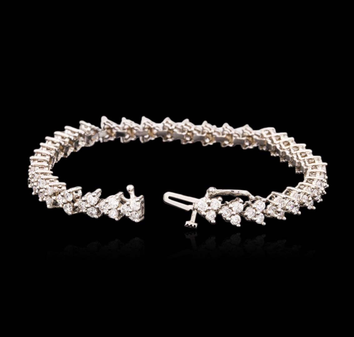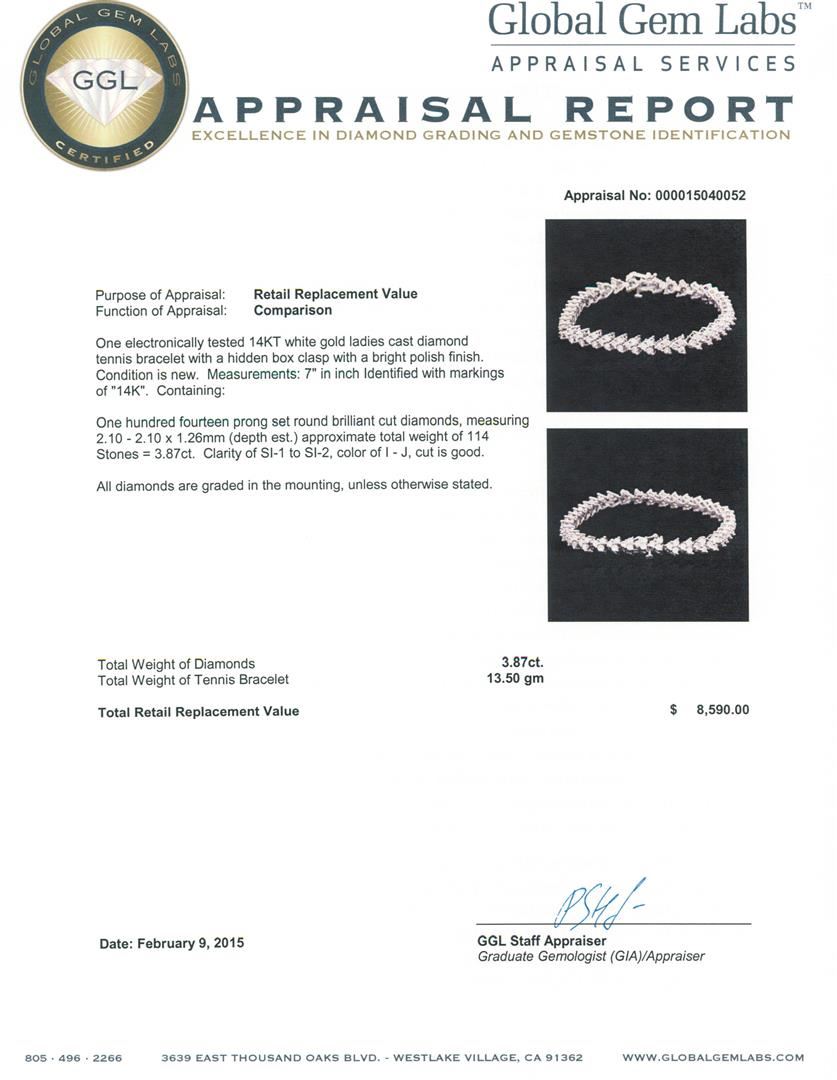 One electronically tested 14KT white gold ladies cast diamond tennis bracelet with a hidden box clasp with a bright polish finish. Measurements: 7" in inch Identified with markings of "14K". Condition is new. Containing: One Hundred Fourteen prong set round brilliant cut diamonds, measuring 2.10 - 2.10 x 1.26mm (depth est.) approximate total weight of 114 Stones = 3.87ct. Clarity: SI-1 to SI-2. Color: I - J, Cut is Good. All diamonds are graded in the mounting, unless otherwise stated. Total Weight of Diamonds 3.87ct. Total Weight of Tennis Bracelet 13.50 grams. GGL Appraised at $8,590.00.