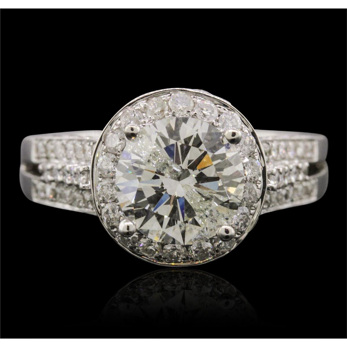 One electronically tested 14KT white gold ladies cast diamond unity ring with a bright polish finish. Condition is new, good workmanship. The featured diamond is set within a diamond bezel supported by an elaborate diamond set under gallery and diamond set shoulders, completed by a three millimeter wide band. Identified with markings of "14K". Containing: One prong set round brilliant cut diamond, measuring 8.26 - 8.24 x 5.01mm approximate weight of 2.18ct with a faint blue fluorescence. Diamond Grading Report attached. Graded in the setting. Clarity: I-1. Color: Depth 60.7%. Table 63.1%. One Hundred Fifty-Four bead set round brilliant cut diamonds, measuring 1.80 - 1.30 x 0.93mm (depth est.) approximate. Total Weight of 154 Stones = 1.69ct. Graded in the setting. Clarity: I-1 to I-2. Color: G - I. Total Weight of Diamonds 3.87ct. Total Weight of Unity Ring 7.09 grams. AIG Appraised at $37,575.00.