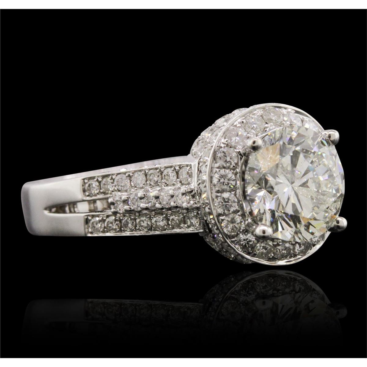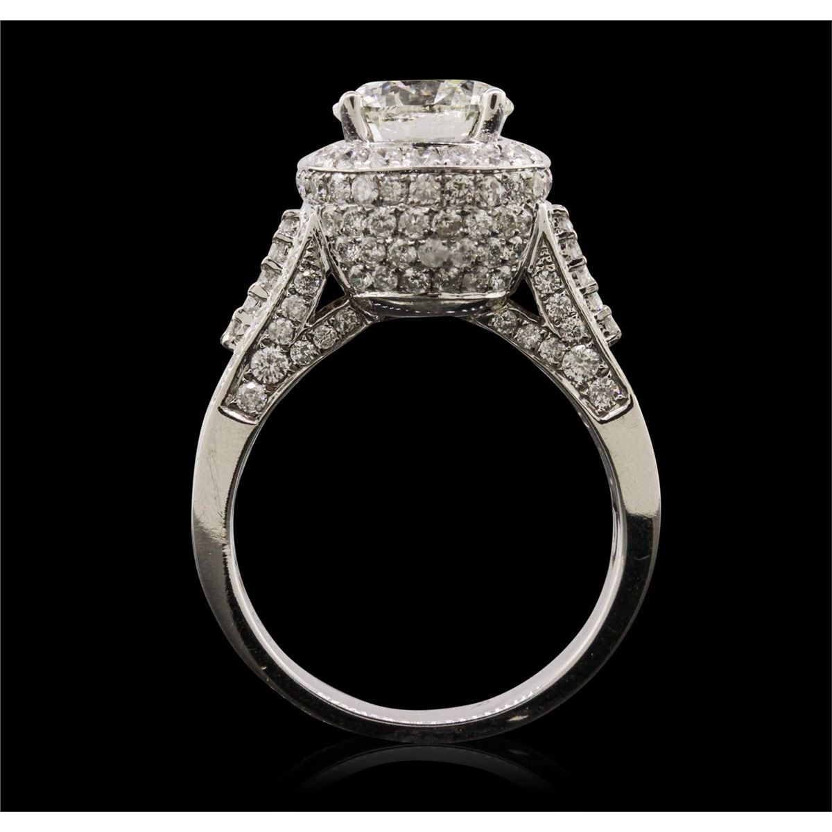 One electronically tested 14KT white gold ladies cast diamond unity ring with a bright polish finish. Condition is new, good workmanship. The featured diamond is set within a diamond bezel supported by an elaborate diamond set under gallery and diamond set shoulders, completed by a three millimeter wide band. Identified with markings of "14K". Containing: One prong set round brilliant cut diamond, measuring 8.26 - 8.24 x 5.01mm approximate weight of 2.18ct with a faint blue fluorescence. Diamond Grading Report attached. Graded in the setting. Clarity: I-1. Color: Depth 60.7%. Table 63.1%. One Hundred Fifty-Four bead set round brilliant cut diamonds, measuring 1.80 - 1.30 x 0.93mm (depth est.) approximate. Total Weight of 154 Stones = 1.69ct. Graded in the setting. Clarity: I-1 to I-2. Color: G - I. Total Weight of Diamonds 3.87ct. Total Weight of Unity Ring 7.09 grams. AIG Appraised at $37,575.00.