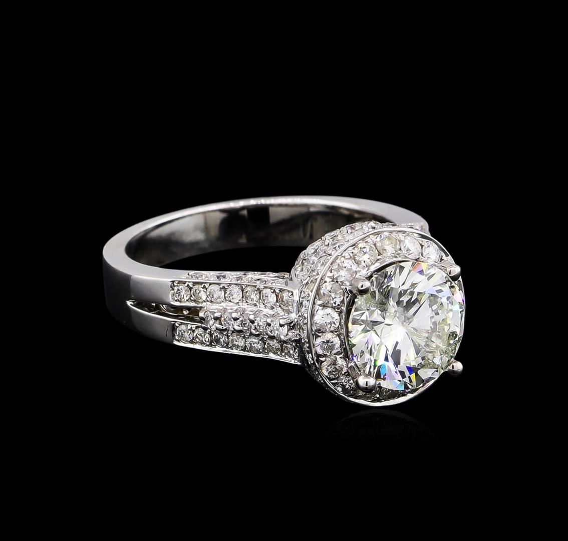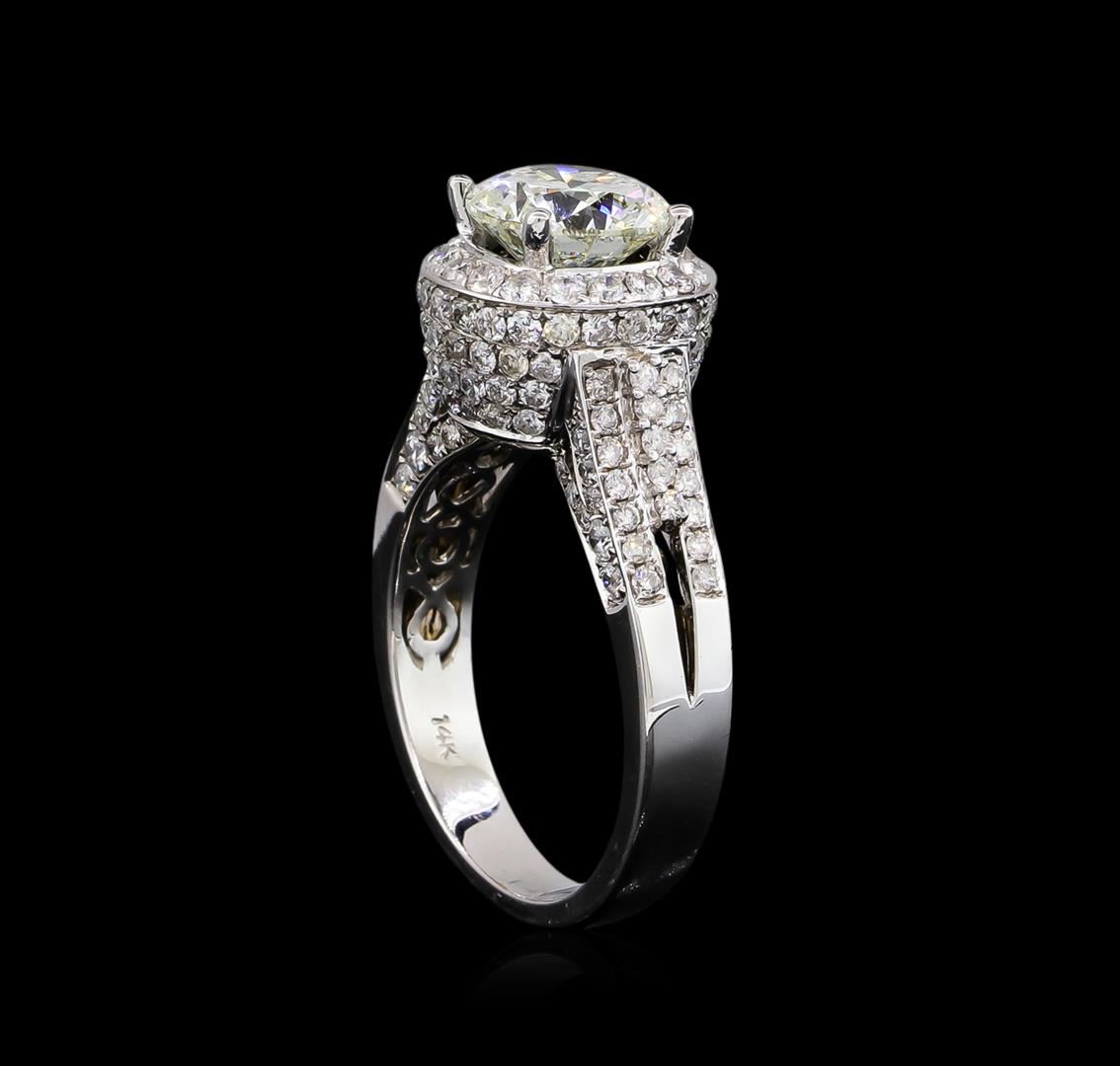 One electronically tested 14KT white gold ladies cast diamond unity ring with a bright polish finish. Condition is new, good workmanship. The featured diamond is set within a diamond bezel supported by an elaborate diamond set under gallery and diamond set shoulders, completed by a three millimeter wide band. Identified with markings of "14K". Containing: One prong set round brilliant cut diamond, measuring 8.26 - 8.24 x 5.01mm approximate weight of 2.18ct with a faint blue fluorescence. Diamond Grading Report attached. Graded in the setting. Clarity: I-1. Color: Depth 60.7%. Table 63.1%. One Hundred Fifty-Four bead set round brilliant cut diamonds, measuring 1.80 - 1.30 x 0.93mm (depth est.) approximate. Total Weight of 154 Stones = 1.69ct. Graded in the setting. Clarity: I-1 to I-2. Color: G - I. Total Weight of Diamonds 3.87ct. Total Weight of Unity Ring 7.09 grams. AIG Appraised at $37,575.00.