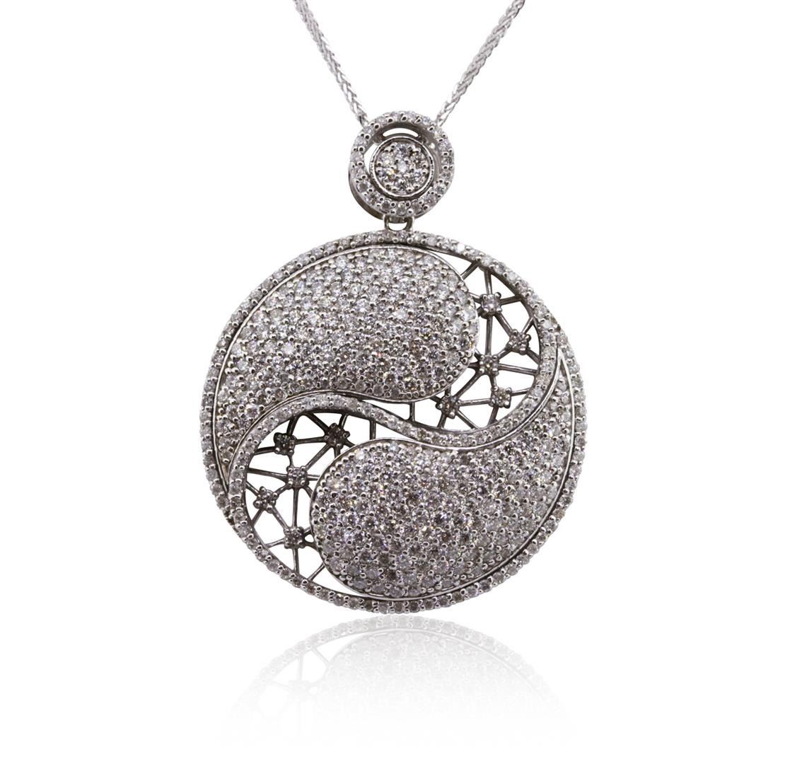 One electronically tested 14KT white gold ladies combination cast & assembled diamond pendant & chain 18.0 long, medium fancy link with a lobster claw clasp with a bright polish finish. Identified with markings of 585. Condition is new. Containing: Five Hundred Forty-Six prong set round brilliant cut diamonds, measuring 1.40 - 1.10 x 0.75mm (depth est.) approximate total weight of 546 Stones = 3.88ct. Clarity: SI-2 to I-1. Color: I - J, Cut is Good. All diamonds are graded in the mounting, unless otherwise stated. Total Weight of Diamonds 3.88ct. Total Weight of Pendant & Chain 15.00 grams. GGL Appraised.