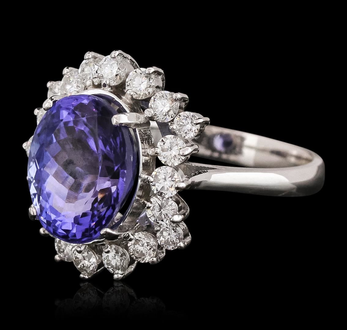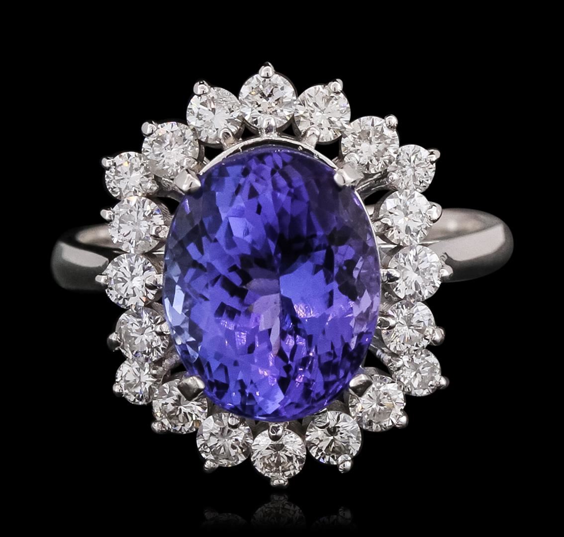 One electronically tested 14KT white gold ladies combination cast & assembled engagement ring with a bright polish finish. Identified with markings of "K14". Condition is new. Containing: One prong set oval modified brilliant cut natural tanzanite, measuring 11.10 x 8.90 x 5.79mm, approximate weight of 3.88ct., clarity is eye clean, type I, medium, moderately strong, bluish violet color, (GIA bV 5/4), cut is good. Twenty prong set round brilliant cut diamonds, measuring 2.20 - 1.80 x 1.20mm (depth est.) approximate total weight of 20 Stones = 0.58ct. Clarity: I-1. Color: I - J, Cut is Good. Colored gemstones are presumed to have been subjected to commonly used enhancement processes. All diamonds and colored gemstones are graded in the mounting, unless otherwise stated. Total Weight of Colored Stones 3.88ct. Total Weight of Diamonds 0.58ct. Total Weight of Ring 5.10 grams. GGL Appraised at $8,915.00.