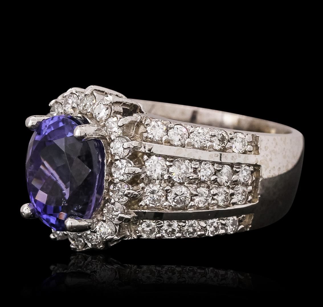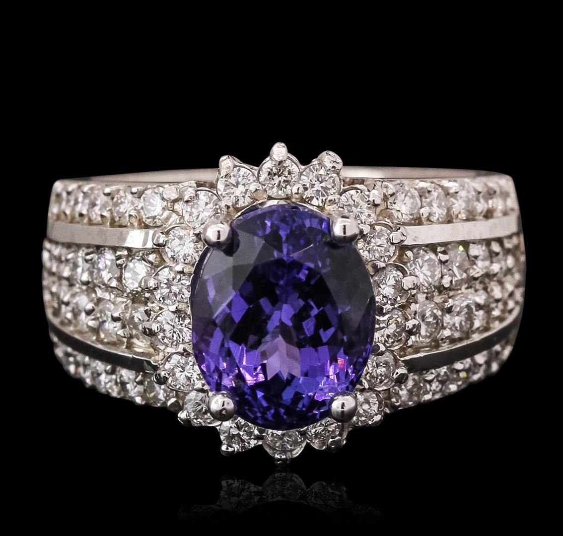 One electronically tested 14KT white gold ladies combination cast & assembled tanzanite and diamond ring with a flat shank with a bright polish finish. Identified with markings of "K14". Condition is new. Containing: One prong set oval modified brilliant cut natural tanzanite, measuring 10.08 x 8.10 x 7.00mm, approximate weight of 3.88ct., clarity is eye clean, type I, medium, moderately strong, violet color, (GIA V 5/4), cut is good. Fifty-Eight prong set round brilliant cut diamonds, measuring 1.90 - 1.80 x 1.11mm (depth est.) approximate total weight of 58 Stones = 1.34ct. Clarity: I-1 to I-2. Color: I - J, Cut is Good. Colored gemstones are presumed to have been subjected to commonly used enhancement processes. All diamonds and colored gemstones are graded in the mounting, unless otherwise stated. Total Weight of Colored Stones 3.88ct. Total Weight of Diamonds 1.34ct. Total Weight of Ring 10.90 grams. GGL Appraised at $10,745.00.